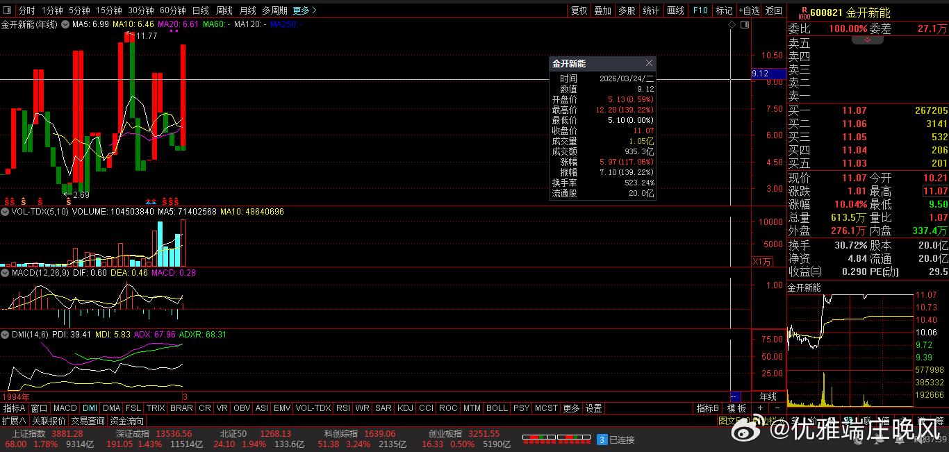 收盘价:11.07 元。涨跌幅:10.04% 。净流入: 9.65亿