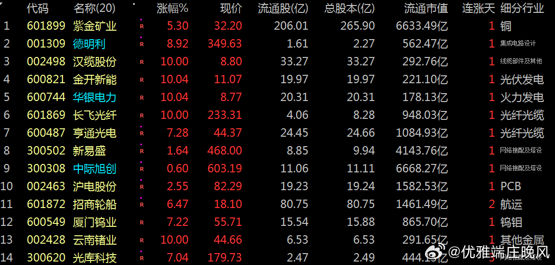 复盘潜龙:浮出水面。今日市场:市场整体:个股大涨,例如紫金矿业、德明利、汉缆股份等。欢声雷动:主力资金大幅抢筹。视野其中:板块轮动:包括市场情绪回暖,当日沪指收涨1.78%。目击板块:电子、有色金属、通信设备、电力等板块主力资金净流入居前,带动相关个股活跃。今日透视:亦或梳理资金流向哪些龙头股: