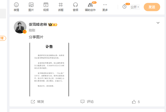 亲爱的张雪峰老师,因心源性猝死全力抢救无效,于2026年3月24日15时50分在苏州逝世。张雪峰老师出身寒门,一生心系广大学子,深耕教育行业,始终以捐资助学,助力学子成长为己任,以赤诚之心践行教育理想,嘉言懿行,启迪后人。