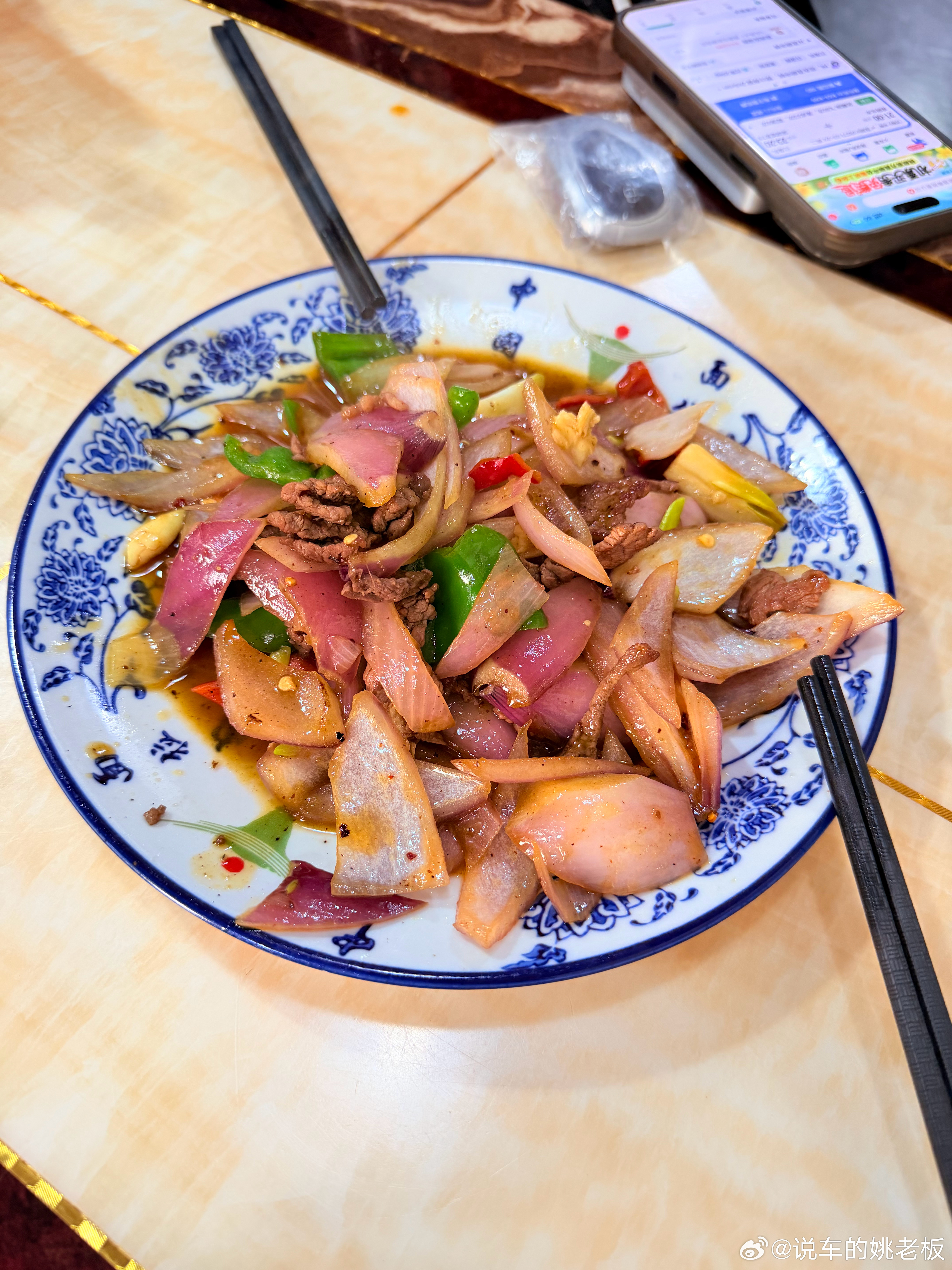 一份洋葱炒牛肉 我数了一下 就6块牛肉 太坑了…….感觉被老板做局了跟姚老板混一