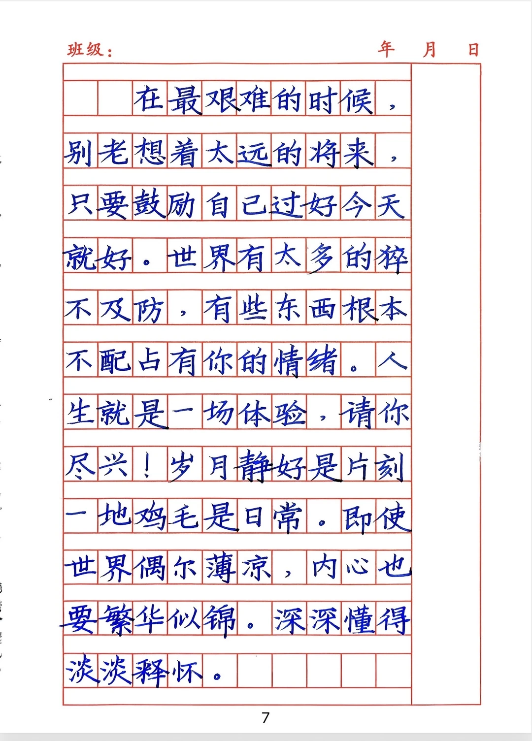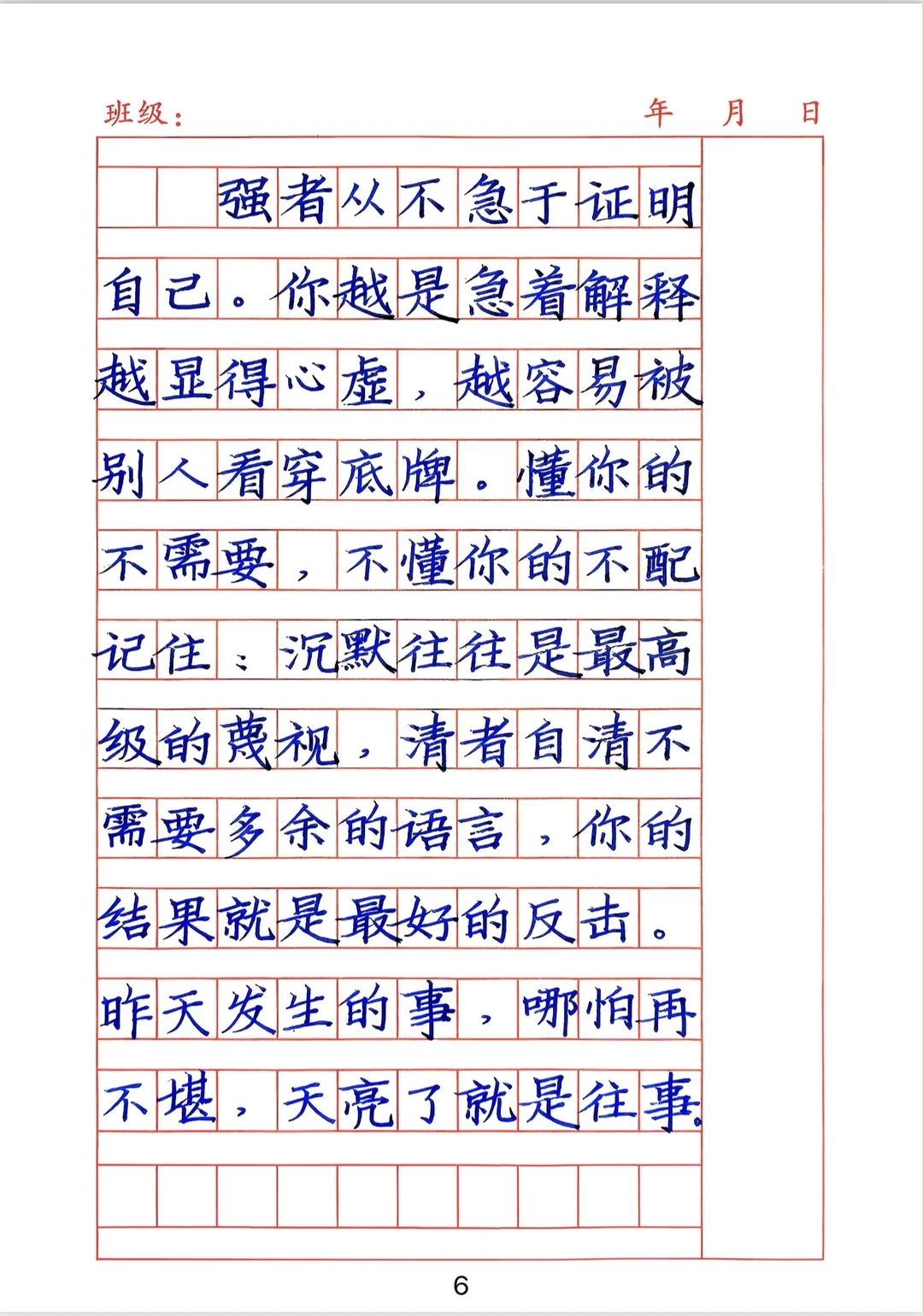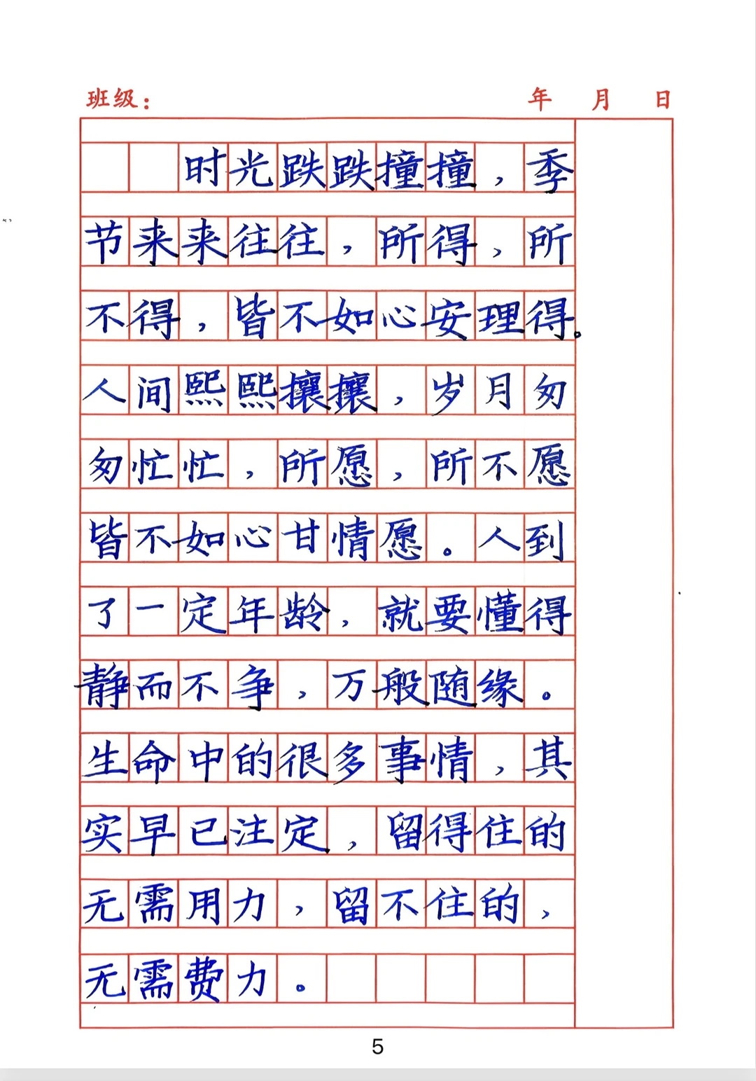 每天写一面,不快不慢,注意笔直紧凑和字的大小排列整齐,每天十分钟左右,坚持一年,进步不会小。楷书快写