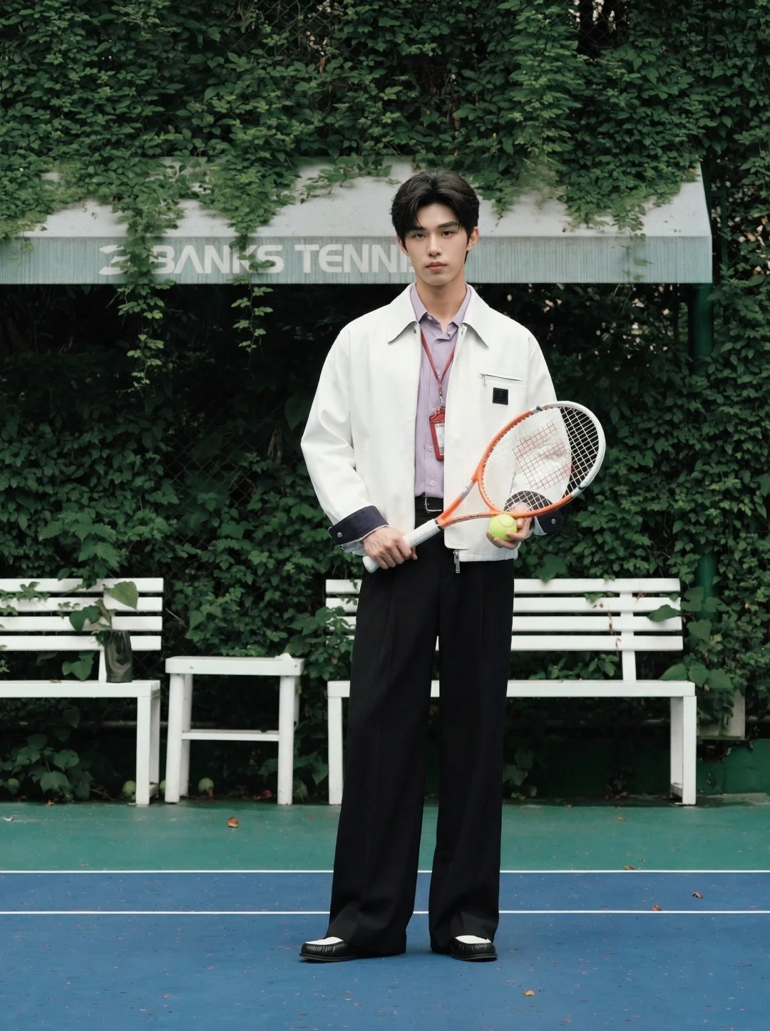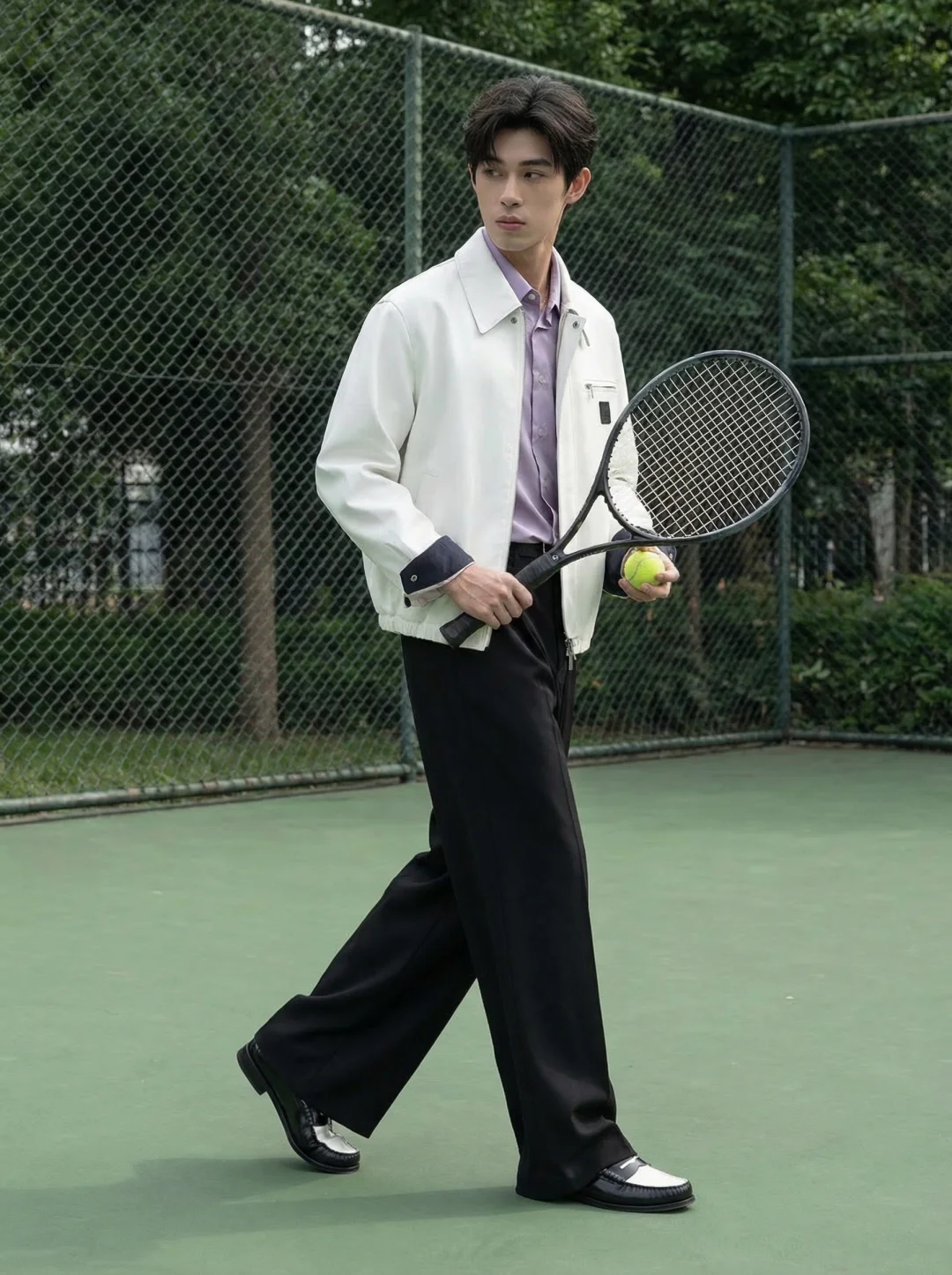 救命,今天这套穿搭真的要把我帅晕了!😭 谁说运动场只能穿球衣? 这一身白色机能夹克+薰衣草紫衬衫, 直接把“干净、清爽、不费力”的少年感拉满了! 走在球场上,感觉空气里都是薄荷味儿🍃。纯棉撞色机能夹克,奶白色真的太提气色了,袖口的深色撞色细节感满满,不会显得单调。划重点!紫色的质感衬衫,低饱和度的紫色不仅显白,还中和了机能风的硬朗,多了一份温柔书生气质。单褶皱阔腿休闲裤,垂坠感无敌!不仅修饰腿型,走起路来带风,随性又自在。 这一身真的太适合约会或者去球场拍照了! 完全不需要刻意摆拍,随手一抓就是大片质感。