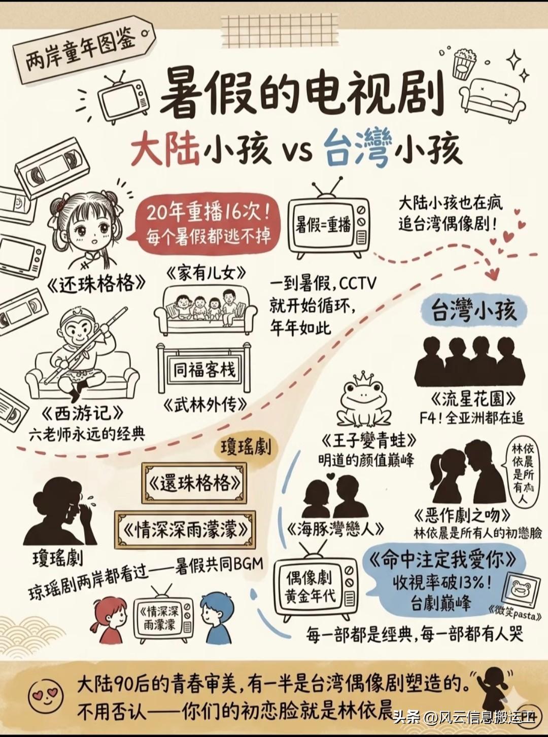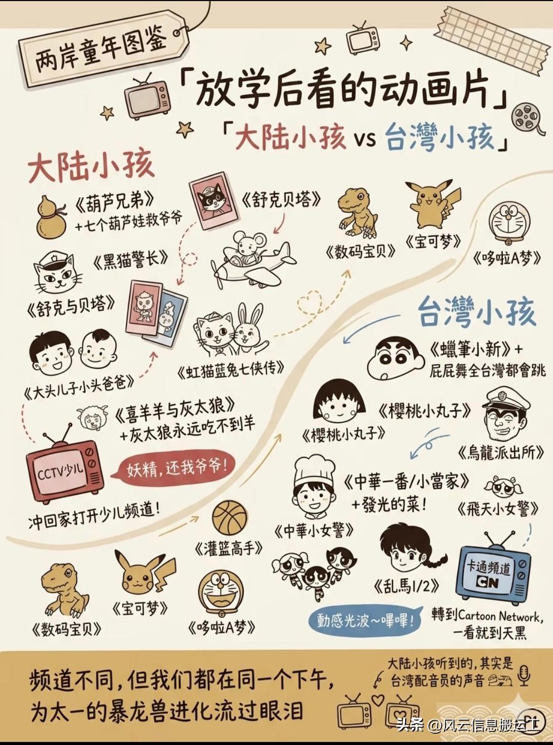有博主整理了八九十年代,大陆小孩vs台湾小孩的童年对比 我个人有点不同的观点,两地小孩追的部分动漫,影视剧,明星,歌曲应该都差不多,只是名字叫法有区别!