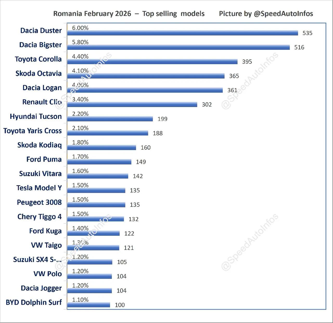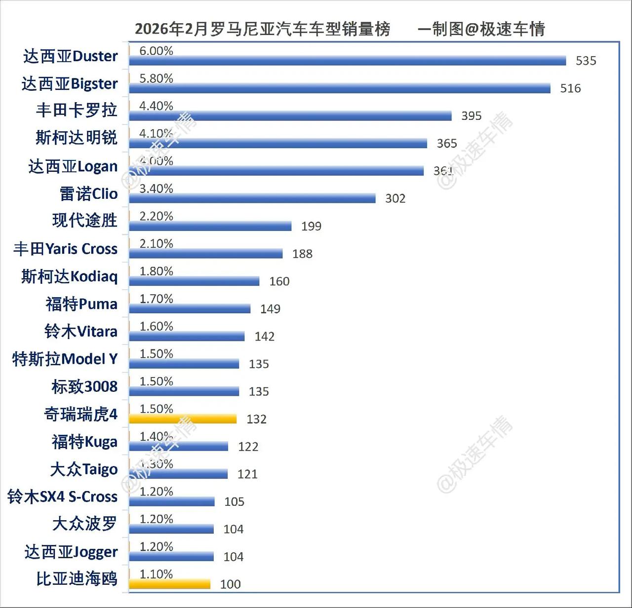 2026年2月,罗马尼亚汽车销量排行榜!奇瑞环比大涨50%挺近前十!比亚迪位居第
