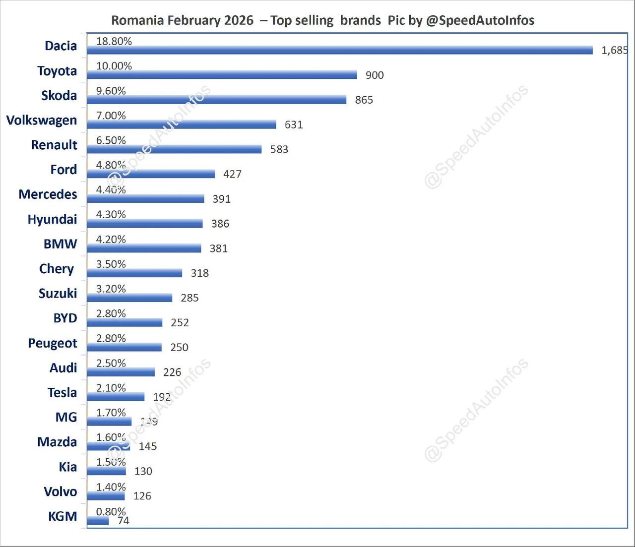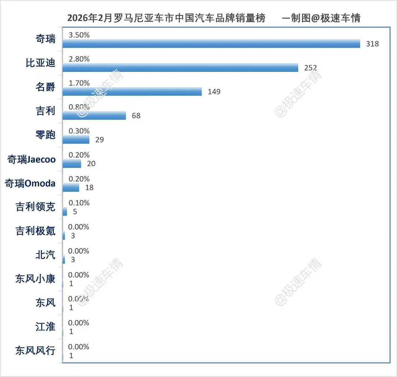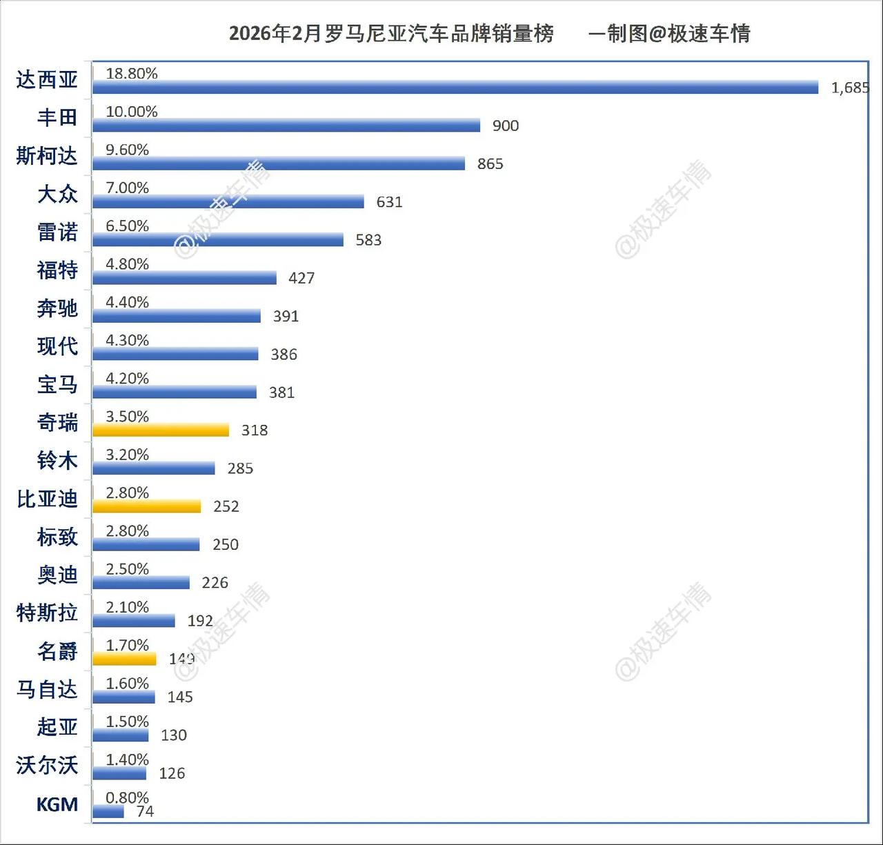 2026年2月,罗马尼亚汽车销量排行榜!奇瑞环比大涨50%挺近前十!比亚迪位居第12!中国汽车品牌市占率9.6%。极速车情 厉害了我的车 罗马尼亚 奇瑞