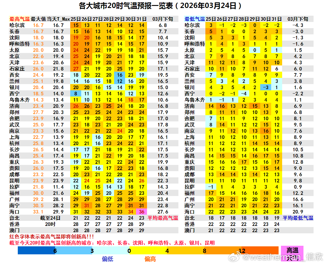 明天新疆因为冷空气影响,有明显降温。但总体连看,一直到月底,我国大部气温虽然有波动,但还是偏暖居多,东北华北和华南,气温偏高相对更明显。海口目前预报3月30-31日,最高气温会升至34-36℃,有可能会冲击今年省会城市的首个高温。海口常年平均的首个高温日,就是3月31日,也是到时候该热了。