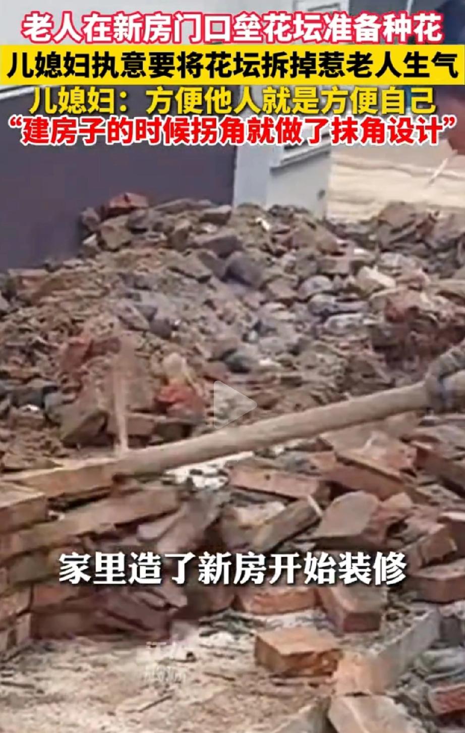 格局大了!河南周口,常女士家的新房正装修,公公在门口拐角处垒了个花坛,想种点花美化环境。没成想常女士坚持要把花坛拆了,老人心里很不痛快。网友:这儿媳格局真大! 常女士家新房正在装修,老人平时就喜欢种花种草,看着新房落成,门口光秃秃的,就琢磨着垒个花坛,种点花,让家门口看起来漂漂亮亮的。 说干就干,老人找来砖头、水泥,一个人在那儿和泥、砌砖,忙活了好一阵子。花坛垒起来后,专门去镇上买了花种,就等着到时候撒进去,看着它们发芽开花。 在老人心里,这花坛就是他给新家添的一份心意,也是他往后日子的一份念想。 可常女士看到这花坛犯了愁,她站到路口仔细看了看,越想越不对劲。花坛正好垒在拐角的位置,原本就窄的路面,被花坛占去了一块。 村里人开车拐弯的时候,视线会被花坛挡住,路也变窄了,稍不注意就可能蹭到花坛,或者跟对面来的车碰上。 常女士心里想:这要是谁家孩子骑车经过,一不小心撞上,摔了可咋整? 其实常女士一家在建房子的时候就考虑过这个问题。那时候他们特意把拐角处的墙面做成了圆角,目的就是让拐弯的车辆能多看到一点路,少一些盲区,方便大家通行。 现在公公垒了这个花坛,等于把之前的好意给抵消了。 常女士琢磨来琢磨去,还是决定把花坛拆了,门口虽是自己家的,但路是大家的。 不能因为自己家想好看,就给别人添麻烦正如她说的:“方便他人就是方便自己。” 现在花坛已经拆了,家门口的地坪也重新打好了。常女士知道公公心里不好受,正想着怎么好好跟老人解释解释,把这事儿说开,让老人别往心里去。 有网友说:“这媳妇做得对!在拐角垒花坛,又挡视线又挡路,万一出事谁负责?她这是为邻里着想,不是不孝顺。” 还网友说:“老人出发点是好的,但位置确实没选对。儿媳妇能顶住压力拆掉,说明她考虑得长远,是个明白人。” 要我说,常女士这事儿办得没毛病。这不是不尊重老人,恰恰是考虑得更周全。门口虽然是自家的地,但路是大家的。 垒个花坛看着是小事,可每天来来往往的乡亲不方便,时间长了,邻里关系也得受影响。 今天你占一点,明天他占一点,村里的路还怎么走? 老人一时想不通,可以理解。他可能觉得面子上挂不住,自己辛辛苦苦弄的东西被否定了。 但常女士能坚持做对的事,同时还想着怎么安抚老人,这已经做得很到位了。 咱将心比心想一想,要是你开车走到这样的拐角,是希望路宽一点好拐弯,还是希望多个花坛挡着? 要是你家孩子在路口骑车,你是希望路通畅一点,还是多个障碍物?道理一说就明白。 老人在新房门口垒花坛 儿媳执意拆掉