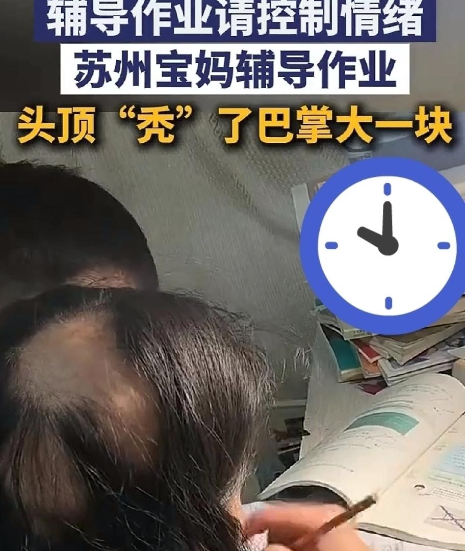 江苏苏州一宝妈领教了辅导孩子作业的个中滋味。 宝妈望子成龙心切,工作之余,还不忘辅导孩子作业。孩子不懂的问题,有时讲解了好几遍,孩子还是一脸茫然。宝妈肝火上升,血压增高。但她还是强忍着情绪不发作,怕吓着孩子,更不好辅导。 长期辅导孩子作业,导致她精神压力大,睡眠差。原本一头秀发,今年1月开始脱落。从指腹大小,两个月就扩展到巴掌大。医生确诊为斑秃,也就是人们常说的“鬼剃头”。 医生介绍,压力导致內分泌紊乱,毛囊受损,致使毛发脱落。 中医认为,长期精神压力,睡眠差,导致血瘀血热,肾气不足影响头发健康。 辅导孩子作业要有良好的心态,学会自我调节。比如,放杯水在身边,当情绪上来时,喝口水,缓解一下心情。或者离开现场,洗把脸冷静下来再沟通。毕竟,自己的身体也很重要。 宝妈辅导作业致严重脱发辅导作业