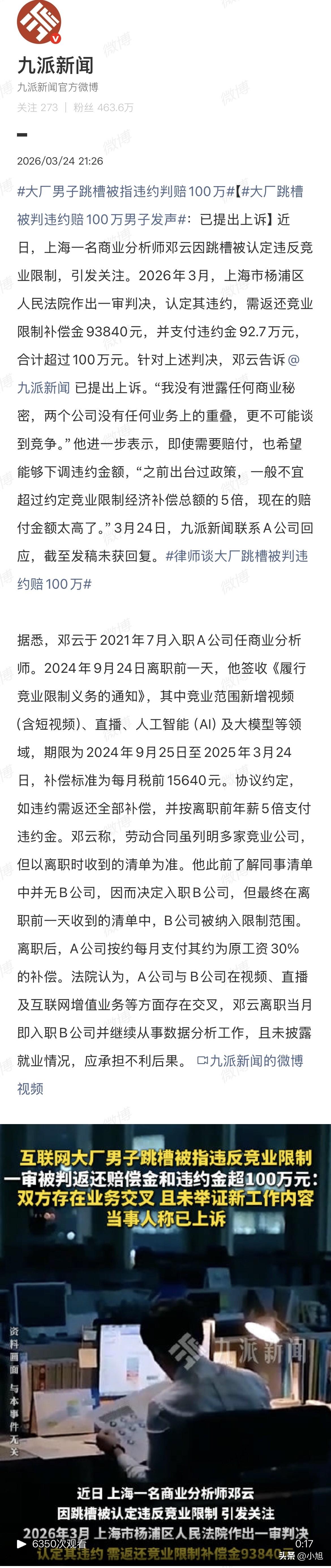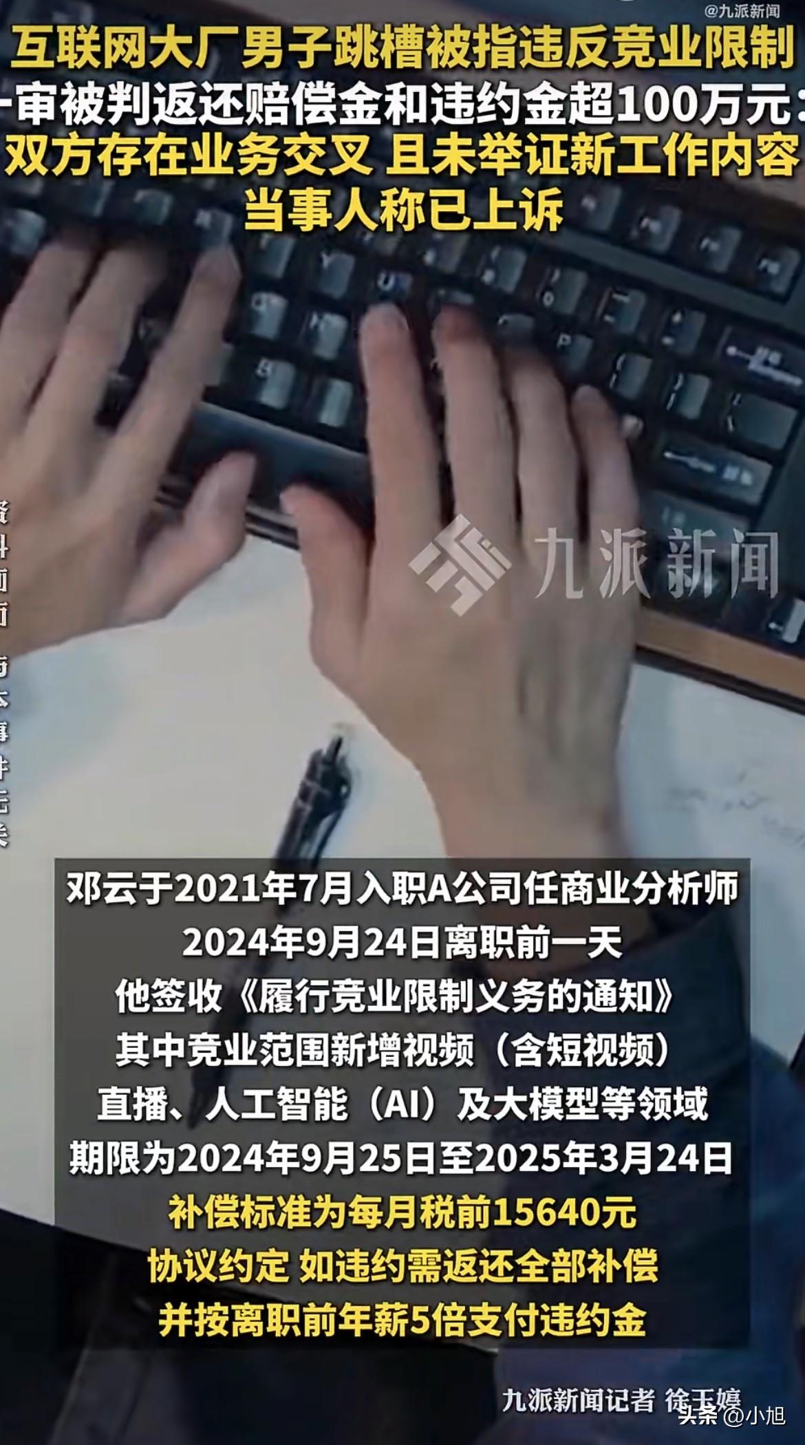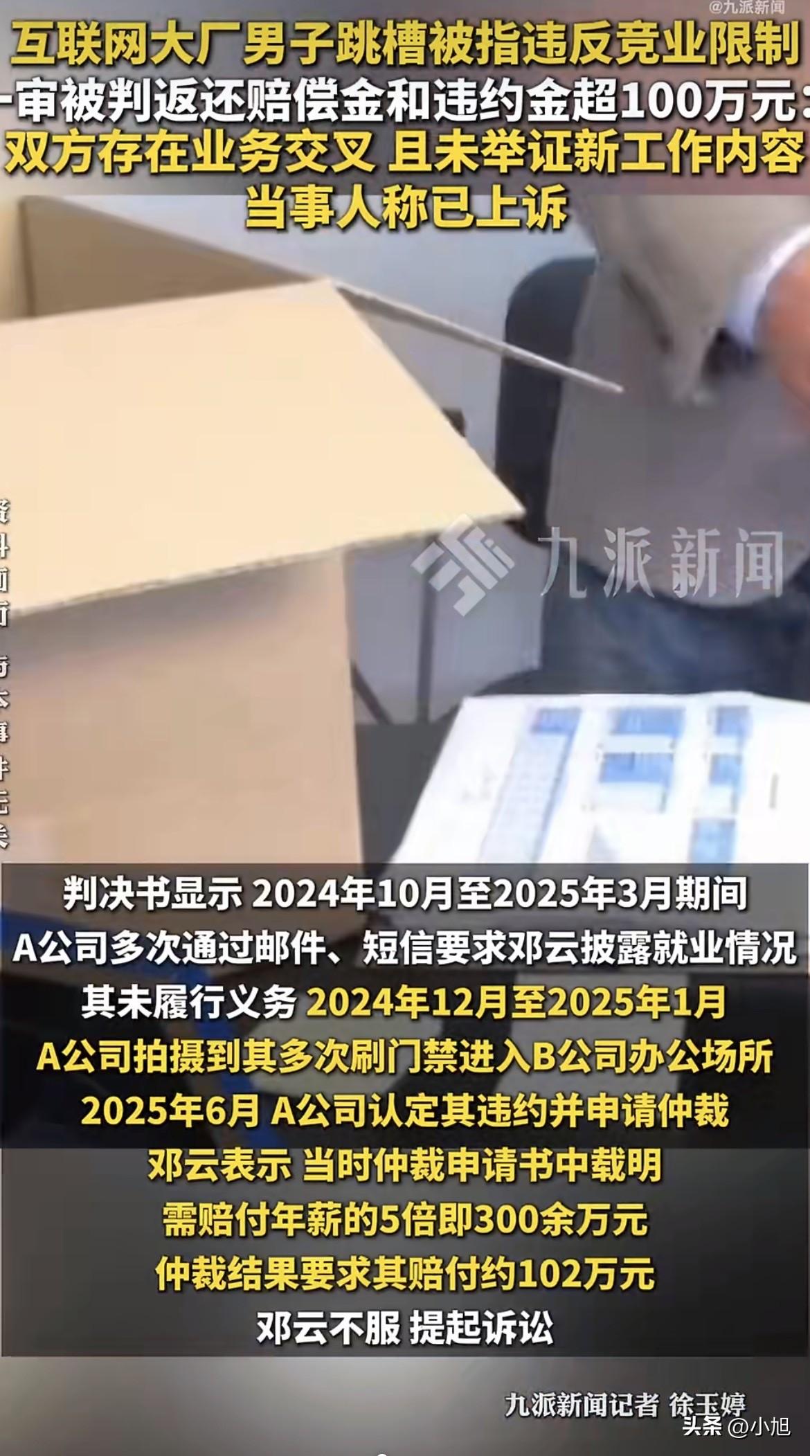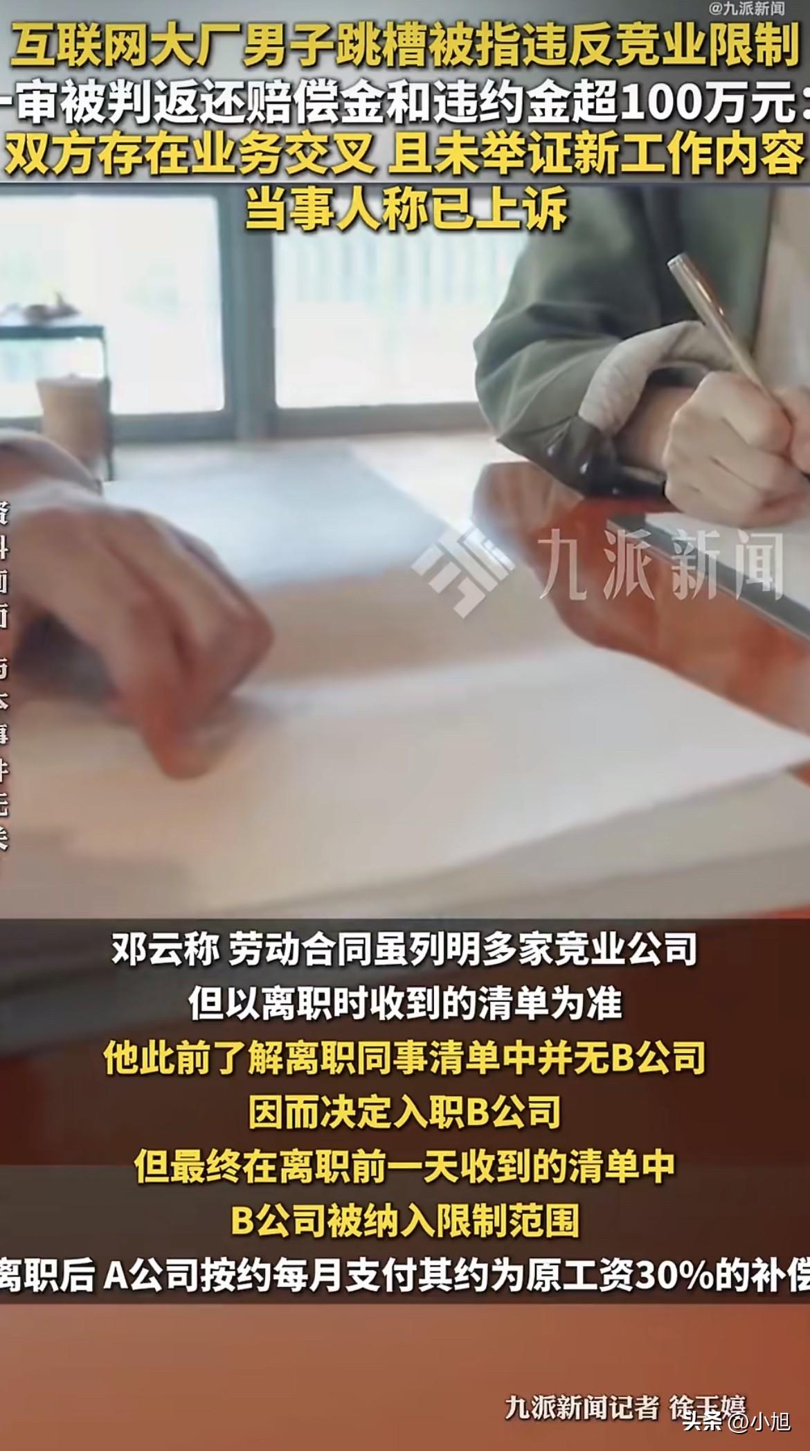 邓云到现在都想不通,他只是换了个工作,怎么就背上了100万的债。 2024年9月24日,离职前一天,他签收了公司发来的竞业限制通知。打开一看,B公司赫然在列。可他明明问过刚走的几个同事,他们的清单上都没有B公司。 邓云当时就懵了。入职通知已经签了,离职手续也办了,想反悔都来不及。 他想了想,还是去了B公司。因为他实在想不通——A公司做生鲜电商和本地生活,B公司做视频,两家业务八竿子打不着。他在A公司分析的是美容美发、医美团购的数据,到了B公司做付费视频数据分析,干的活完全不一样。 这能算违反竞业限制吗? A公司不这么想。从2024年12月到2025年1月,他们派人蹲点,拍到了邓云持续性、规律性地刷门禁卡进出B公司大楼的画面。不仅如此,这期间A公司多次发邮件、发短信让他汇报就业情况,邓云一条都没回。 2025年6月,仲裁申请书来了。A公司索赔300多万——正好是他年薪的5倍。 2025年8月,仲裁结果出来:返还补偿金93840元,支付违约金92.7万,合计102万。法院一审维持了这个结果。 法院的理由是:两家公司都有视频、直播、互联网增值业务,存在业务交叉。 邓云不服。他说,视频直播只是个工具,不是业务本身。“任何一家公司如果有视频或者直播,难道这些跟A公司都有业务重叠吗?” 这话问得在理。如果“有视频”就算竞争关系,那几乎所有互联网公司都可能被划进去。 邓云说,A公司的竞业清单几乎把能想到的互联网公司都列上了,如果严格按照清单,他没有公司能入职。 他还有房贷要还。每个月税后1万多的补偿金,只有原工资的30%。 这个案子最让人揪心的,不是邓云有没有违约,而是——他压根没办法提前知道自己违约。 离职前一天才拿到清单,前一天去问同事,同事的清单上还没有B公司。公司的竞业清单随时在变,每个人的清单都不一样。 这不是给劳动者挖坑吗? 湖北的律师余昊说,判断两家公司有没有竞争关系,法院得实质审查——不能只看经营范围写了什么,要看实际经营内容、服务对象、对应市场。最高法2021年有个指导案例,专门强调了这一点:不能仅从登记的经营范围重合来认定竞争关系。 那才是正解。两家公司做什么、卖给谁、市场在哪,这些才是判断标准。 还有一个问题:违约金太高了。 人社部2025年发布的《企业实施竞业限制合规指引》第十四条写得清清楚楚:违约金一般不宜超过竞业限制经济补偿总额的5倍。 邓云的补偿金总额是93840元,5倍应该是46.9万左右。但法院判了92.7万,接近补偿金的10倍。 湖北的律师游盼说,这个指引虽然只是指导性文件,没有法律强制力,但已经成为司法裁判的重要参考。 那这个案子,是不是跑偏了? 有人说,竞业限制是为了保护商业秘密。可邓云根本没有泄密,两家公司业务也没重叠。这不是保护商业秘密,这是在用人单位的利益和劳动者的生存之间,选了一边倒。 2025年9月,最高法出台劳动争议司法解释(二),明确了一个原则:如果劳动者没接触过商业秘密,竞业限制条款不生效。人社部的指引也强调,劳动者仅掌握行业通用的专业知识和技能,工作中接触到的仅为企业一般经营信息,不属于负有保密义务的人员。 这些新规,就是想堵住竞业限制被滥用的口子。 可现在的问题是,邓云这个案子一审判决的时候,这些新规刚出来没多久。法院用的是老思路——看经营范围有没有重合。 邓云已经上诉了。二审怎么判,关键看他能不能拿出证据,证明两家公司业务确实没有重叠,证明他接触的不是商业秘密。 100万,对一个大厂打工人来说,是几年的积蓄。房贷还要还,工作还要继续。 这场官司,打的不是邓云一个人的事。它关系到每一个签过竞业协议的人:你到底能不能换工作?你的下一份工作,会不会让你背上100万的债? 你说,这算保护商业秘密,还是堵死了普通人的出路? 来源:九派新闻等