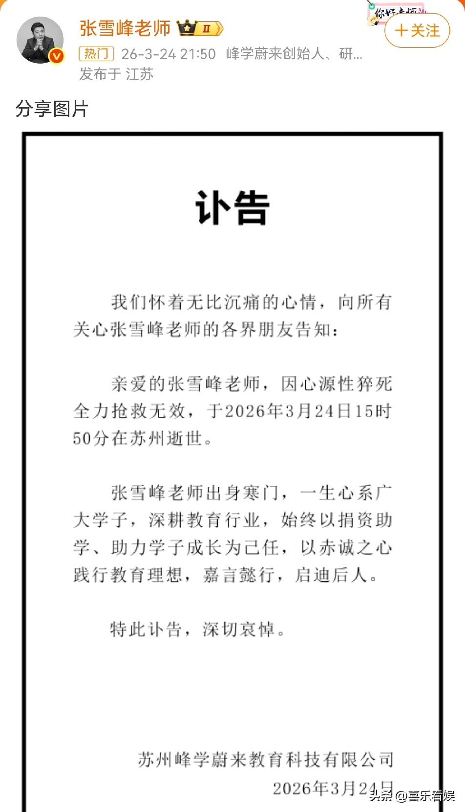 张雪峰,让全网痛哭! 3月24日晚21:50,张雪峰公司和他的账号突然发布讣告,说他因心源性猝死,医院全力抢救也没能留住,15点50分在苏州永远离开了我们。 讣告里写着,他出身寒门,一辈子都心系广大学子,深耕教育这么多年,始终把捐资助学、助力学子成长当成自己的责任,用最赤诚的心践行教育理想,嘉言懿行,启迪后人。 这消息一出,全网瞬间痛哭,难过,评论区全是舍不得的声音: 有网友红着眼说:“我家孩子当年填志愿全靠张老师,他一句‘选对专业比考高分更重要’,直接点醒了我们全家,现在孩子毕业就进了对口好单位,真的太感激他了。” 还有人感慨:“他说话太敢了,把教育里的那些弯弯绕绕都摊开讲,虽然有人骂他博眼球,但更多人把他当成救命稻草,现在这根给寒门子弟托底的稻草,断了。” 更有不少学生留言:“还想等他下次直播讲考研,还想让他帮我看看专业怎么选,怎么就走了呢……” 其实懂的人都知道,张老师这些年有多拼。 他经常熬夜到凌晨开直播,跑遍全国各地开讲座,嗓子哑了还在硬撑着讲,就怕孩子们踩坑、走弯路。 他不是什么完美的教育家,就是个接地气的“过来人”,用最糙的话,讲最真的理,帮无数迷茫的家庭抓住了改变命运的机会。 他才41岁,正是该好好歇一歇的年纪,却永远的走了。
