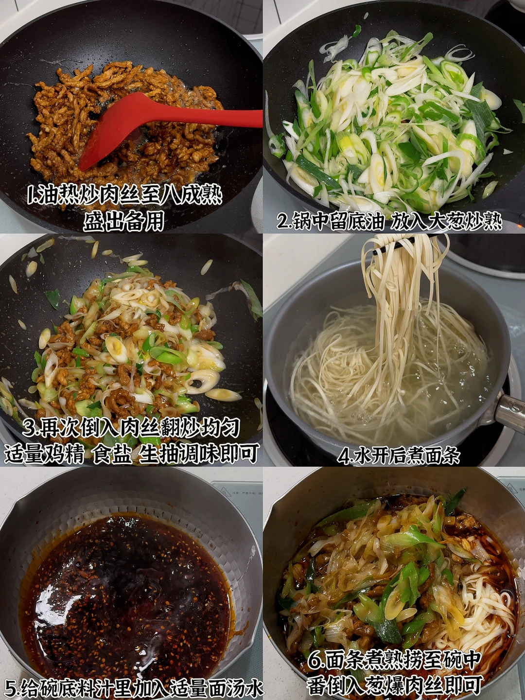 📜食材:大葱、猪肉丝 🍳做法: 1.起锅烧油,油热炒肉丝至八成熟盛出备用 2.锅中留底油放入大葱炒熟 3.再次倒入肉丝翻炒均匀 4.适量鸡精,食盐,生抽调味即可 5.水开后煮面条 6.给碗底料汁里加入适量面汤水 7.面条煮熟捞至碗中,放入葱爆肉丝搅拌均匀即可。