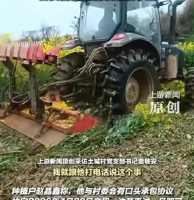 2026年3月20日湖北赤壁,30亩1.5米高油菜眼看一个月后就能收割卖油,却被两台农机直接推平,农户几个月心血瞬间成空,这反差实在太扎心。 赵先生承包的这片高标准农田,长势正旺,本该是丰收在望。事发前他完全没收到任何通知,事后才知道是村委会安排的行动。村里解释说租金到期没交,联系不上人,为了把地腾给另一家公司种双季稻,只能先推掉,还说油菜秆还能当绿肥。 赵先生却拿出当初的口头协议,明确去年4月底承包,今年租金要到4月30日才到期,现在才3月,怎么就成了违约。双方说法完全对不上,一个说1月该交,一个说4月才到,公婆各有理。 警方和镇政府很快介入调解,最终双方达成赔偿协议,事情暂时平息。但这场纠纷暴露出的问题,却远不止一笔赔偿能解决。 农村土地流转本是为了提高效率,让地有人种、粮有人产。可口头协议常见,沟通一断档,就容易闹成这样。尤其现在正值第二轮土地承包到期后延长30年的整省试点期,农业农村部数据显示,全国大量农户面临续包,稳定预期特别关键。如果基层处理时简单用推平方式解决问题,不仅浪费了已经投入的劳动和资源,还可能让更多种地人心里打鼓,不敢放心流转或扩大种植。 油菜作为重要油料作物,2024年湖北产量已接近300万吨,2025年继续保持增长势头,每一亩成熟作物都关系到粮食安全和农民收入。纠纷中直接毁掉即将收获的庄稼,不仅让农户损失明显,也让土地的季节价值白白流失。 类似案例提醒大家,土地流转再怎么急着调整农时,都该走书面约定、提前告知、协商在前的路子。契约精神和对农业生产的敬畏,才是让乡村土地真正活起来的根本。处理好这些细节,种地人的心才能稳住,粮食生产的链条才能不断。
