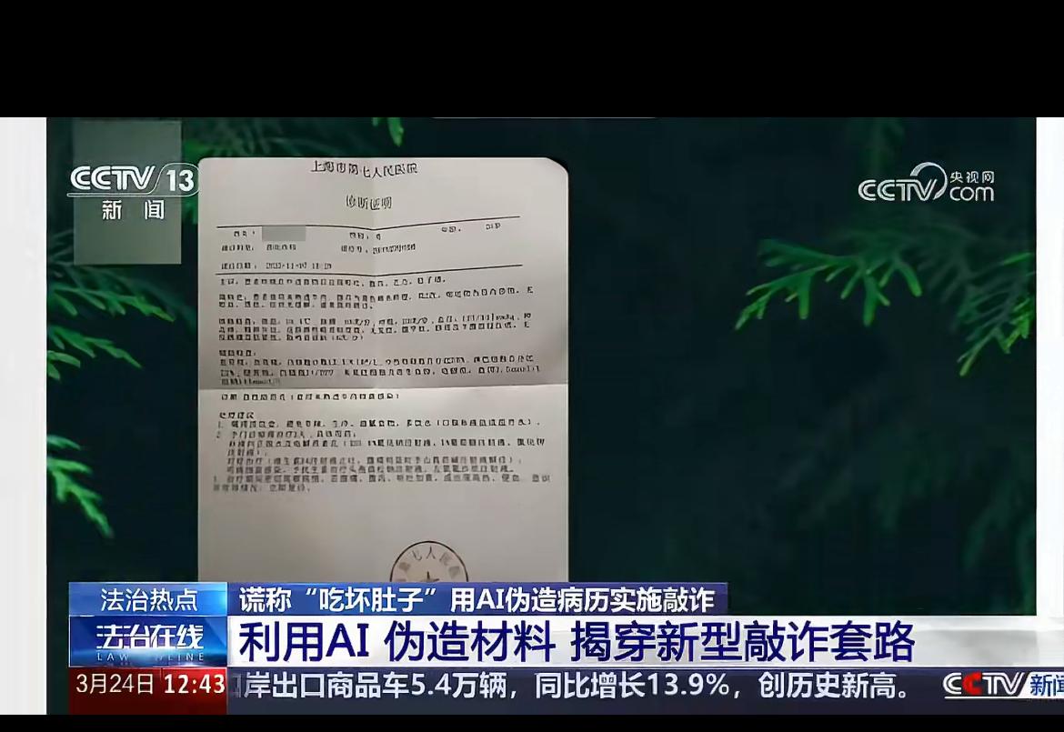 男子动歪脑筋,利用 AI 制作假病历,以食物中毒为由敲诈多个餐馆。男子杨某偶然发现 AI 可以生成任意的图片,就萌生了利用假病历去敲诈餐馆的想法。他在网上下载到一份病历,再利用 AI 生成以他的名字,规定的日期,以及生病记录等病例素材,再去物色餐馆吃饭。吃完后拿着病历去找餐馆索赔,先后有两家餐馆上当赔付了 2500 块。到第三家老板坚决不承认,在第四家的时候老板看了他的病历起了疑心,专门去核实了当晚用餐的其他食客,大家都表示没有问题。老板怀疑是敲诈,于是报警。警察仔细核对病历,找到破绽,证实这名男子是涉嫌敲诈。