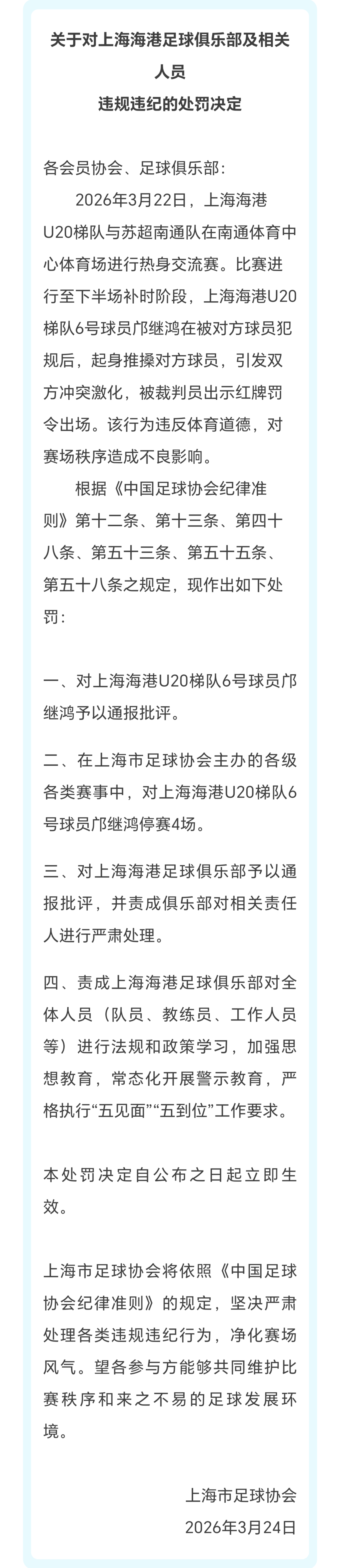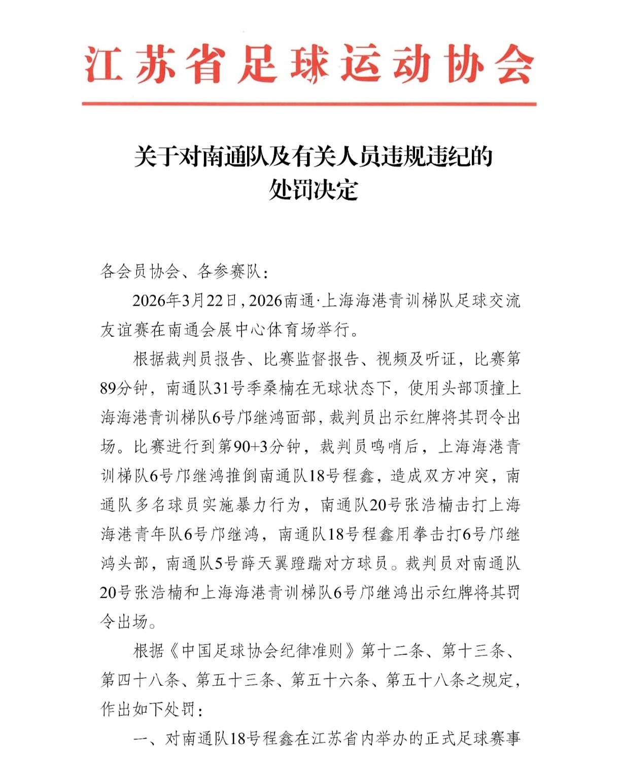 苏超南通队对海港U-20队热身赛打架的事,上海足协出面处罚了海港小球员,停赛4场!江苏足协处罚南通队员,停赛5-8场,铁路警察,各管一段。中国足协没亲自出面,由地方足协负责处罚。 南通队多名球员遭到重罚,本赛季苏超成绩估计要受到点影响了。苏超 南通海港热身赛爆发冲突