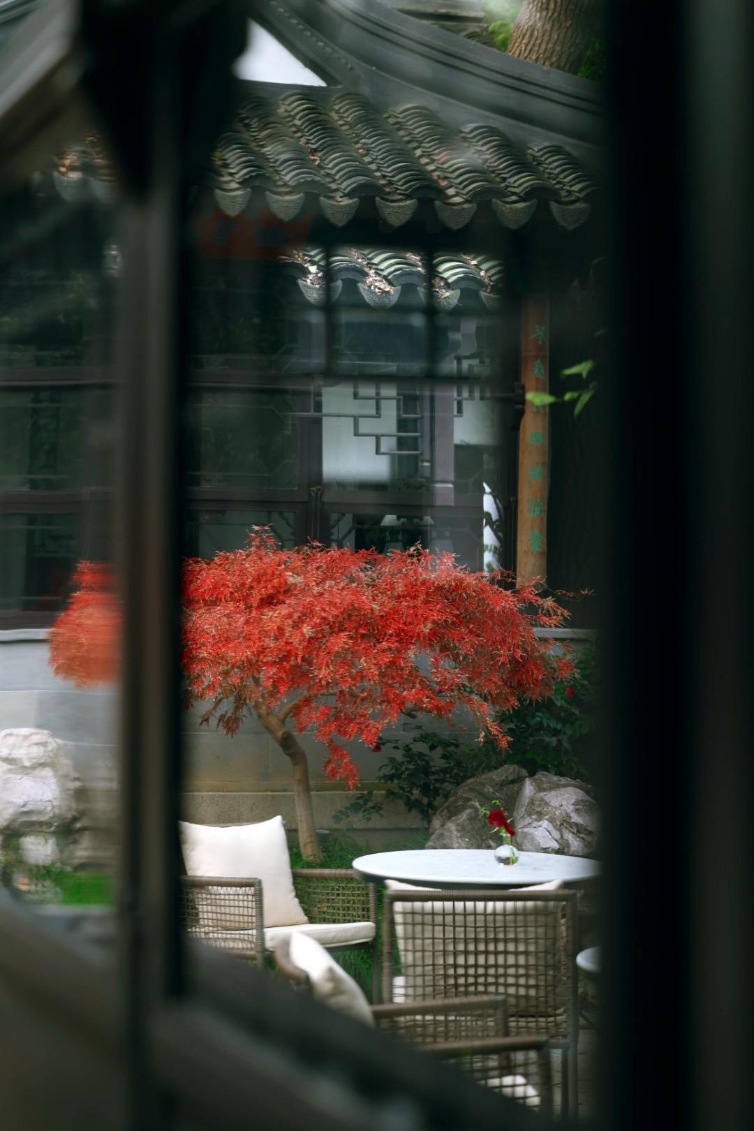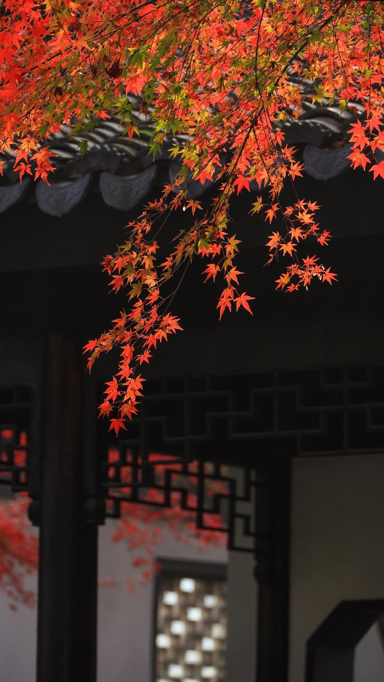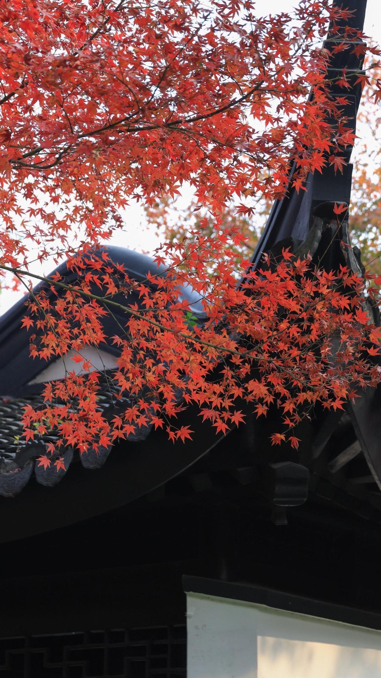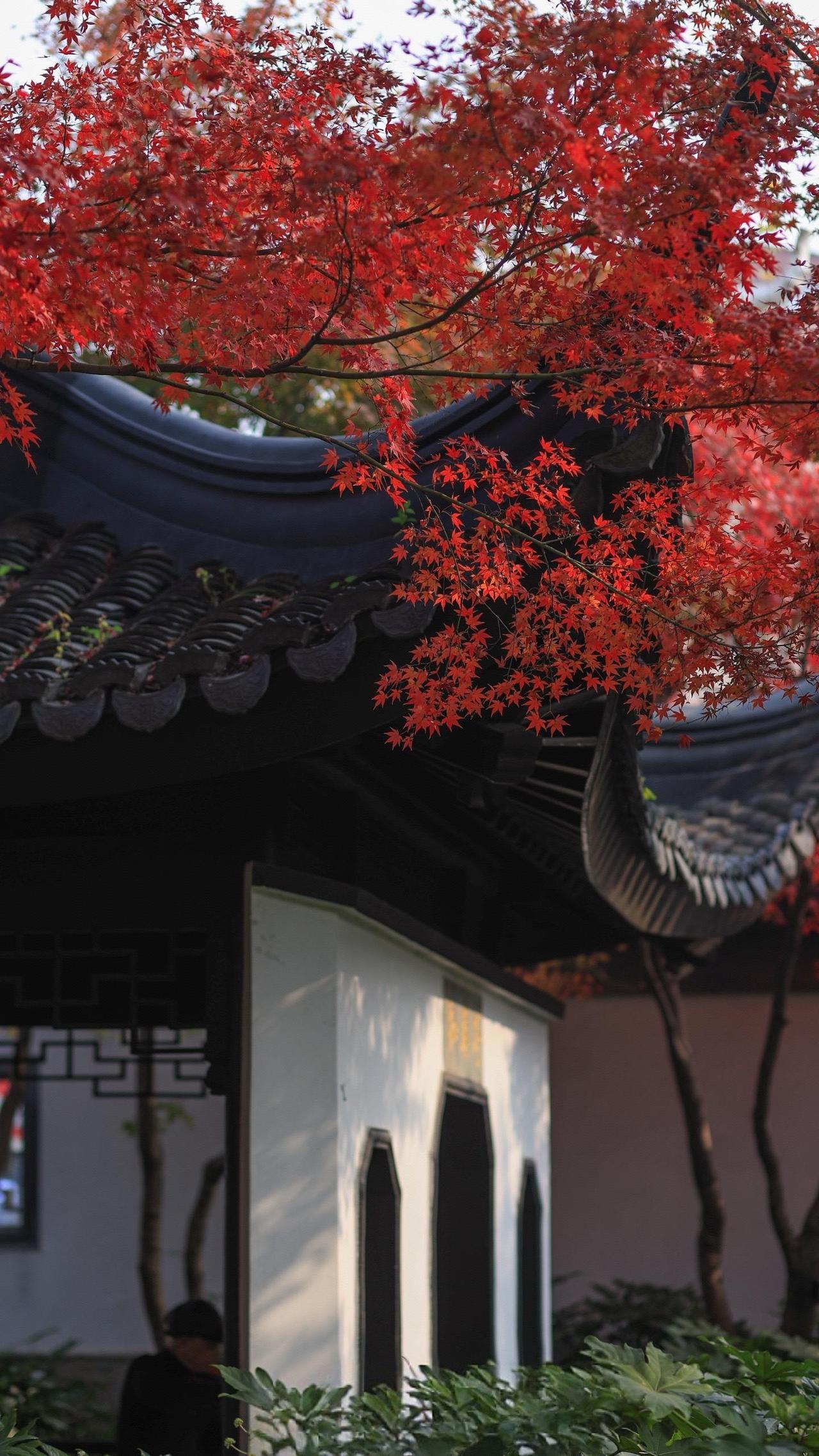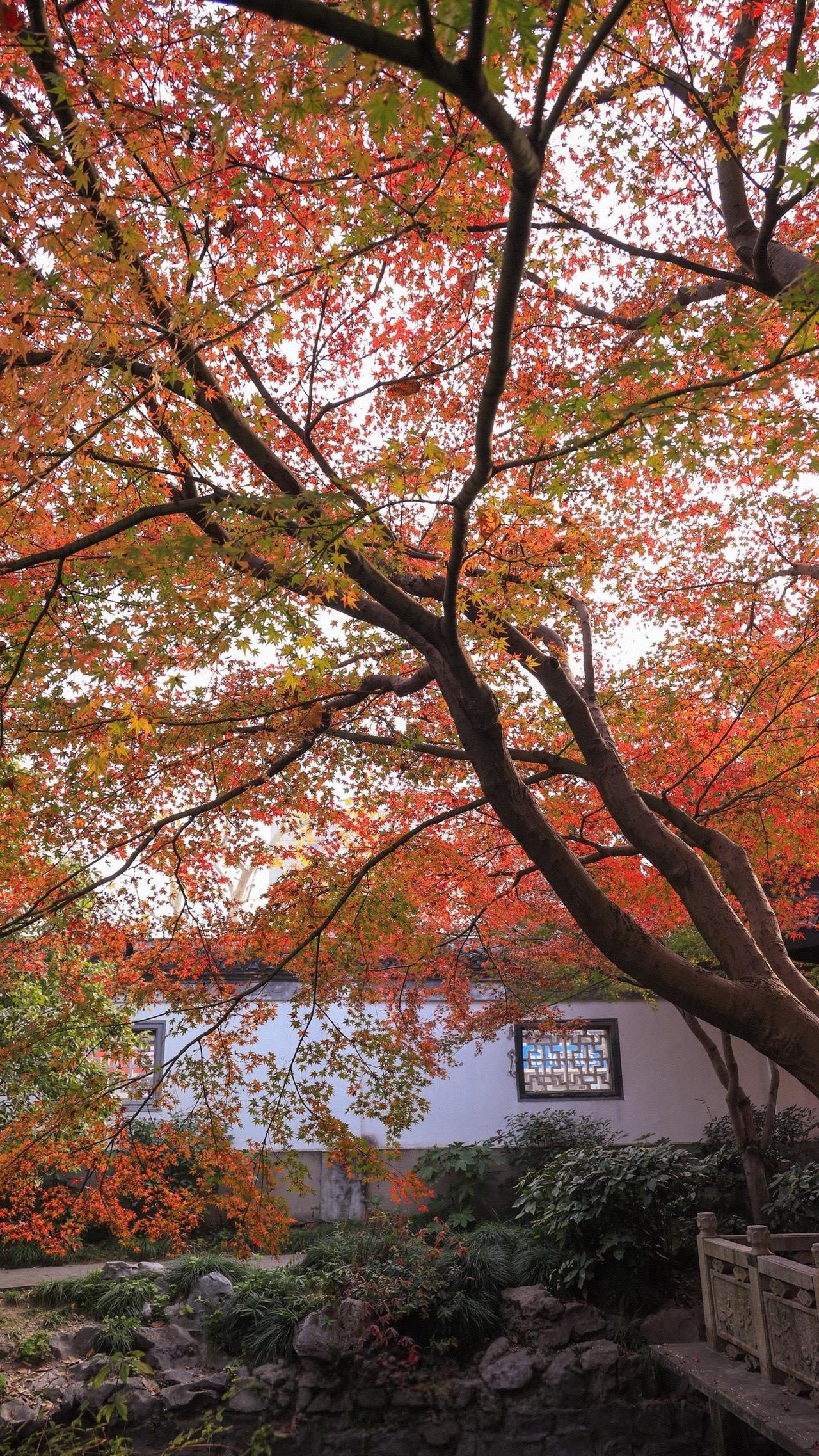 瞻园的红枫大概把秋天所有的浓烈都攒在了这里,透过花窗看见的是半框流丹,转过回廊撞