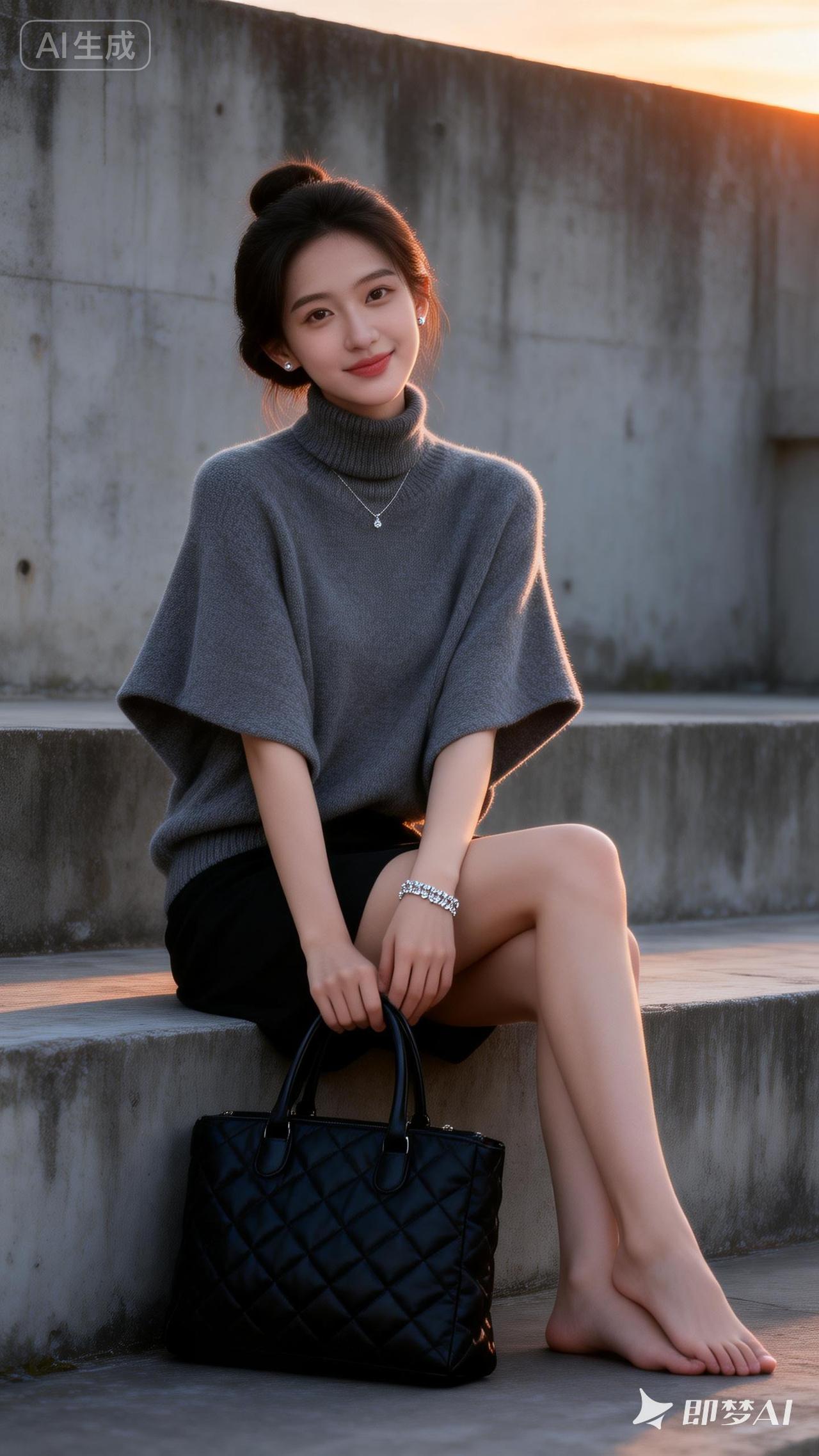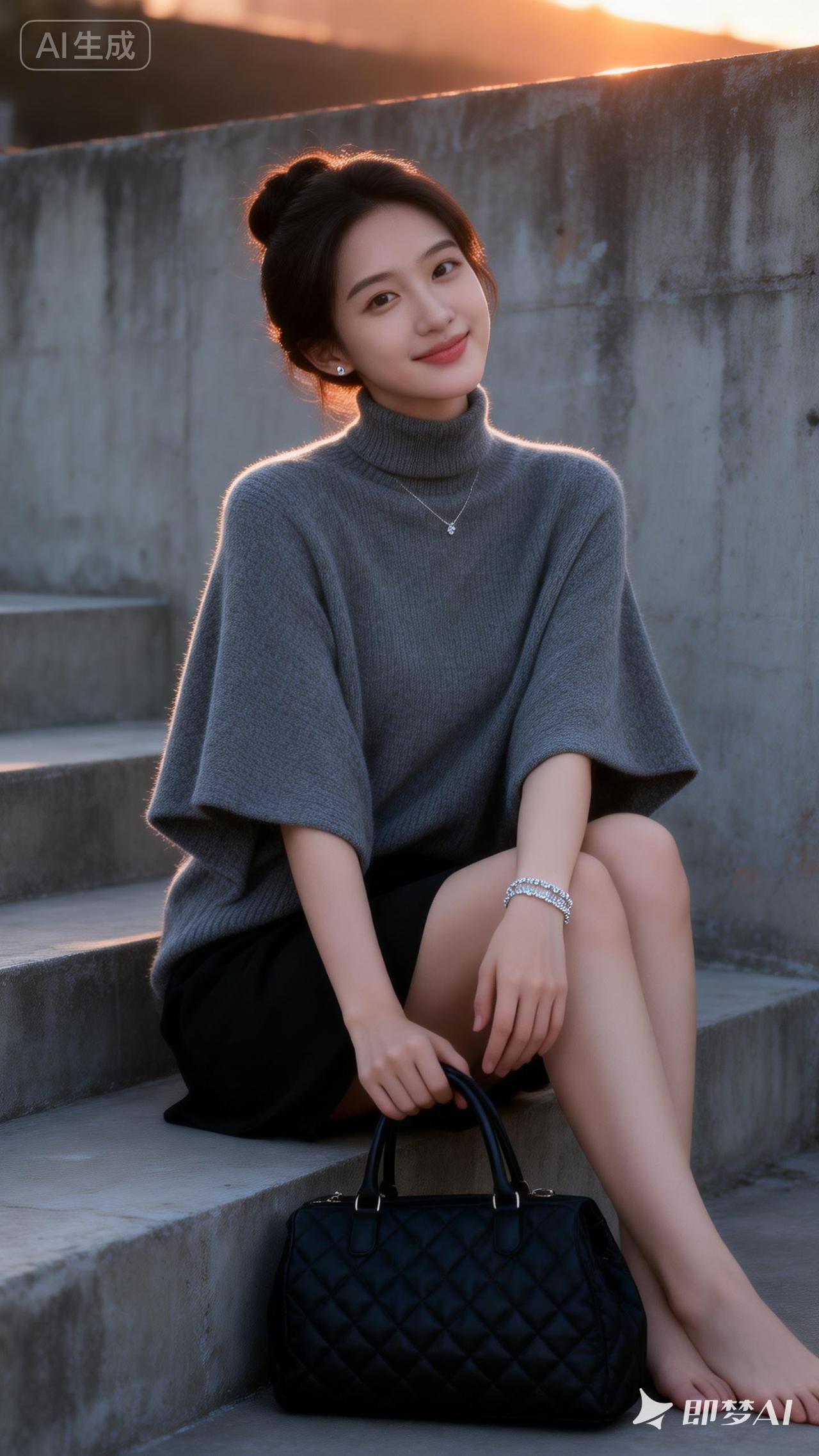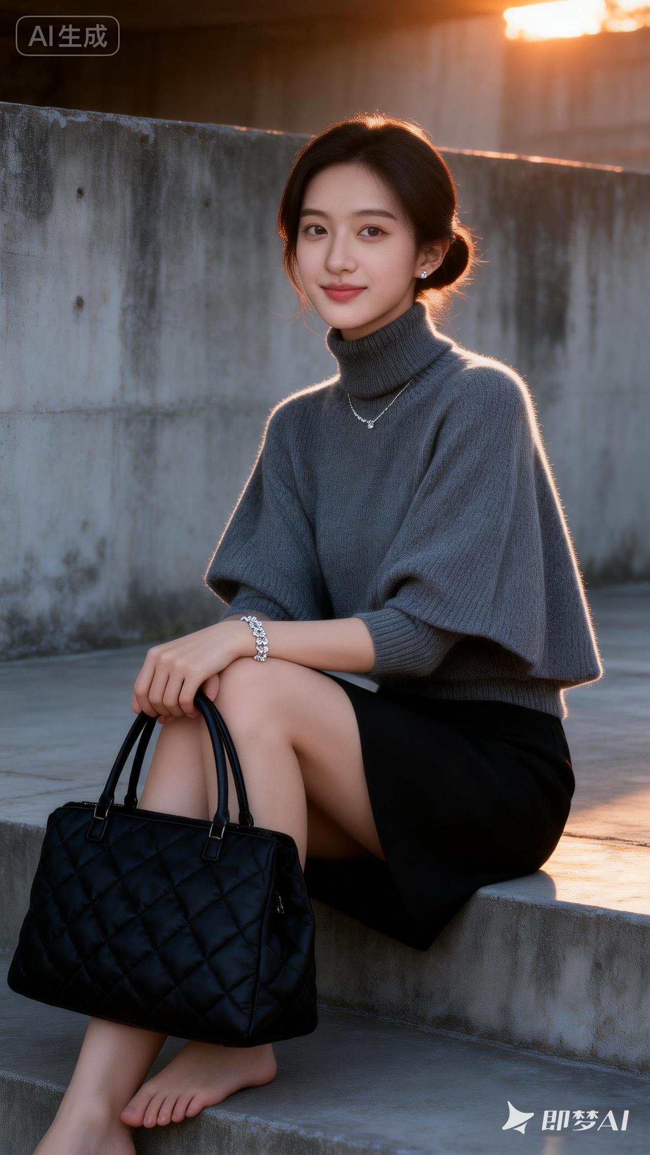 都市时尚少女,优雅坐台阶,手提包相伴,轻松自在。