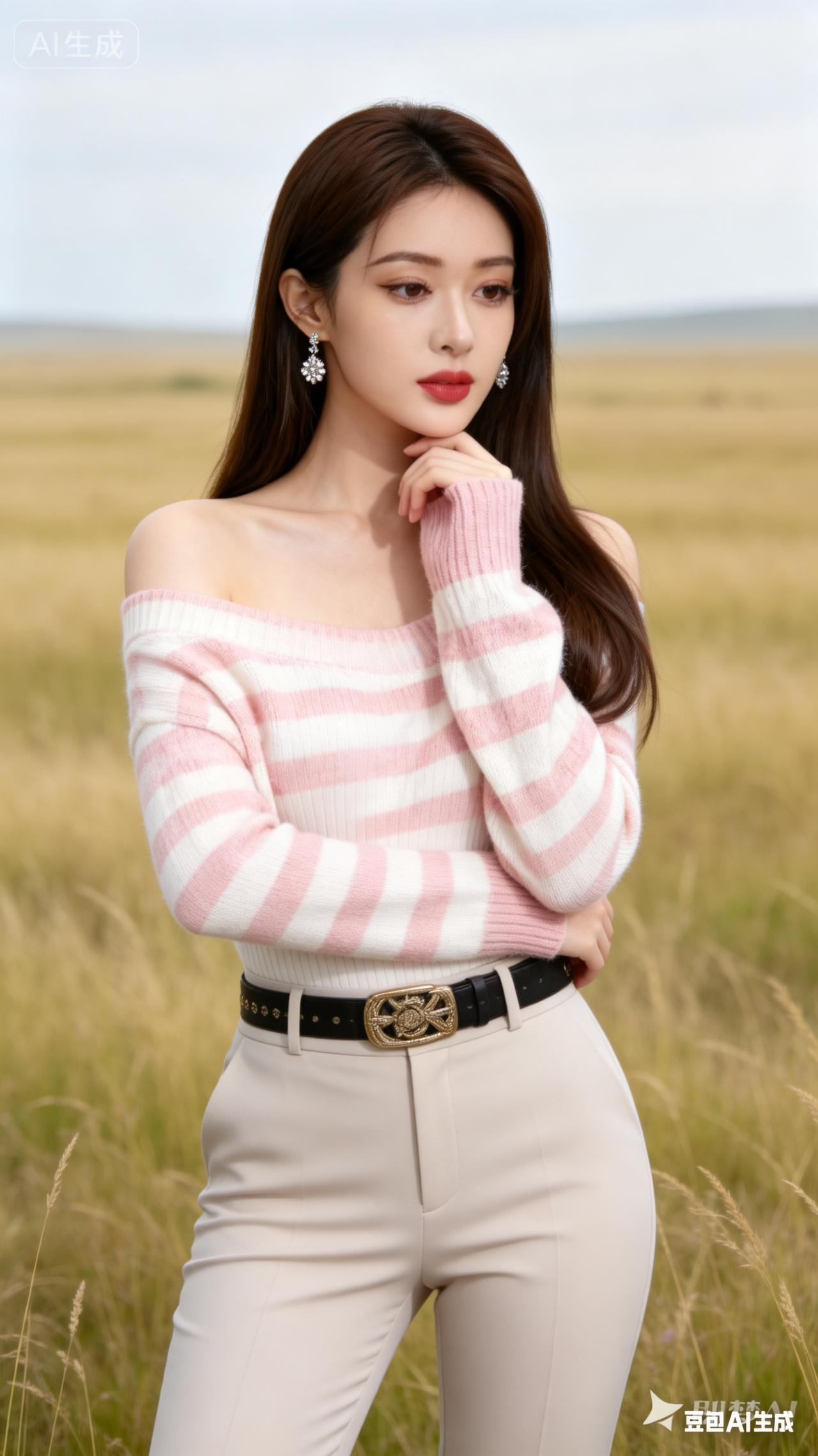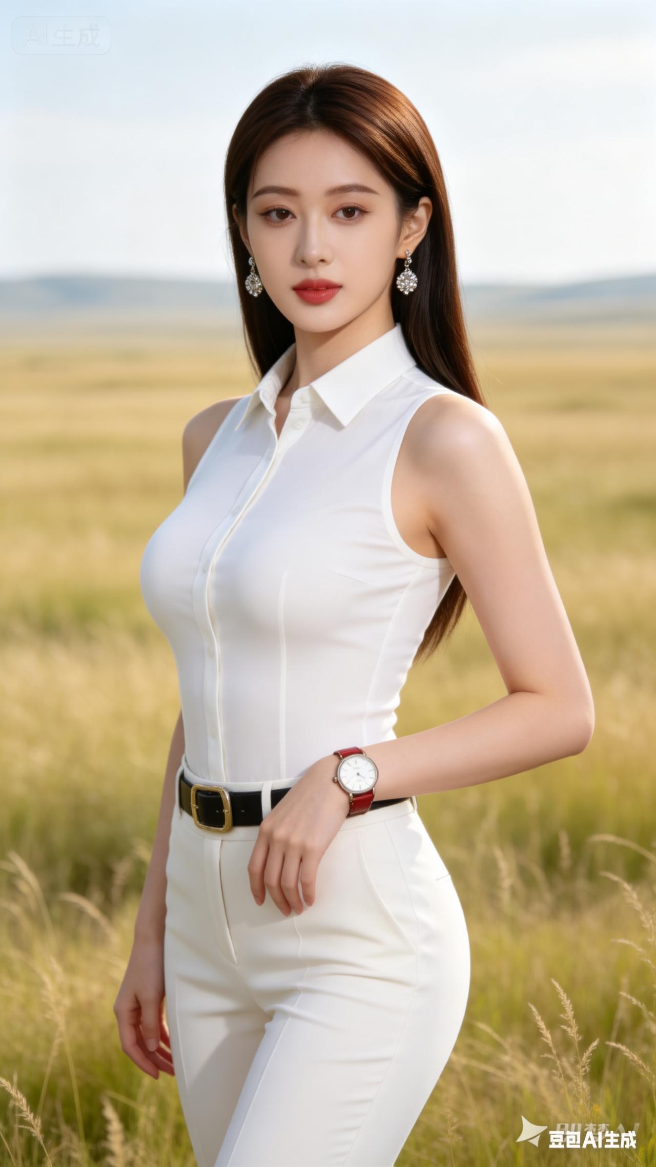 优雅白衬衫,草地上的时尚女王
