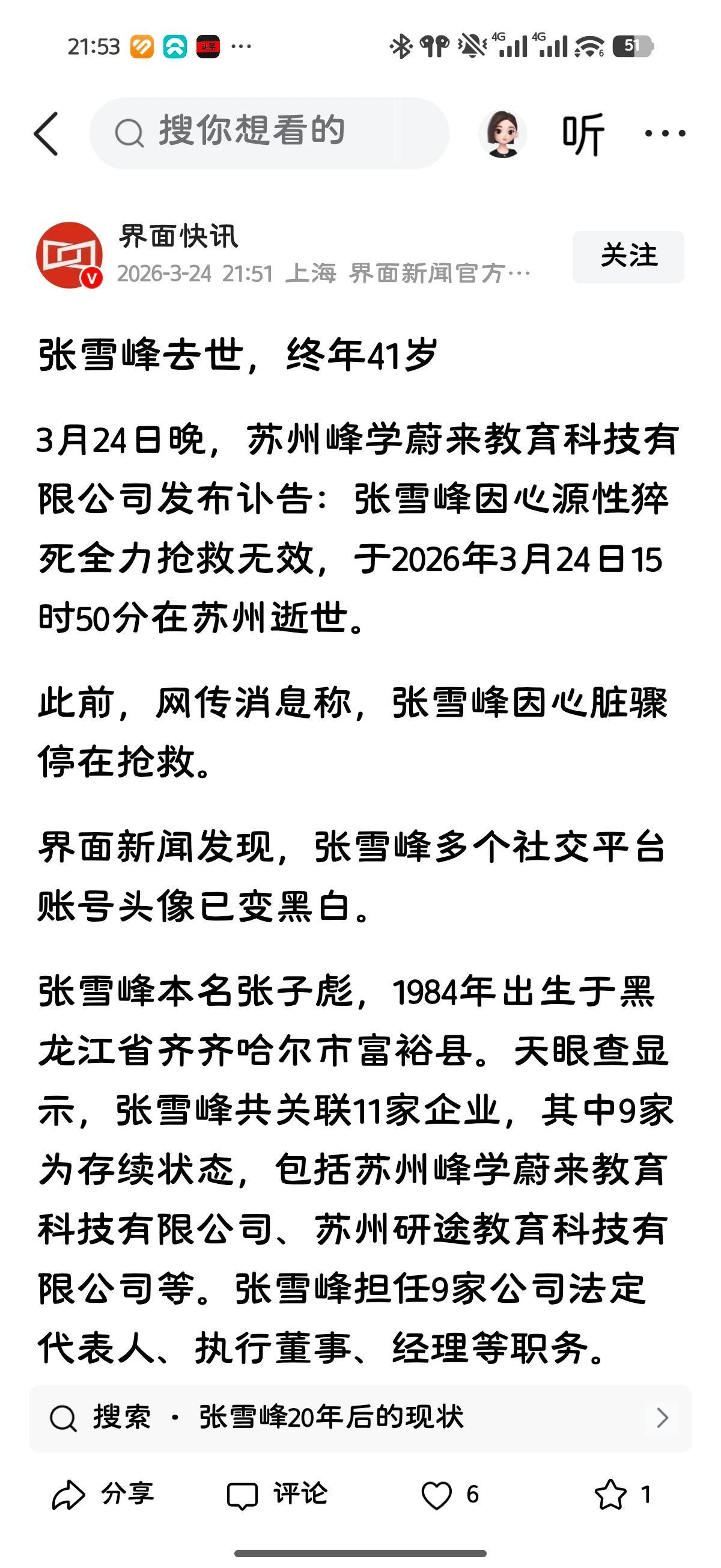 张雪峰走的时候应该最放心不下自己的女儿吧,他是那么疼自己的宝贝女儿。他之前直播的时候说,为了把所有的爱给自己的女儿,二胎都没打算要。他想把全天下最好的东西都给到女儿。 可是天有不测风云,人有旦夕祸福,张雪峰却因病骤然离世。 虽然张雪峰给母亲和妻子,女儿留下了几辈子都能衣食无忧的财产(张雪峰拥有八个公司),但是我相信他的女儿宁愿所有的财产都不要,宁愿每天粗茶淡饭,平平安安过小确幸的幸福日子,只要能换回爸爸的命,她会在所不惜。 我比张雪峰大两岁,作为同龄人,同是80后,我深切的感受到,没有什么比健康更重要的了。 我们一定要维护好自己的健康,因为我们这个年龄,不是为自己而活,我们上有老,下有小,责任在肩,关注自己的健康,就是在维系好自己的大家庭。