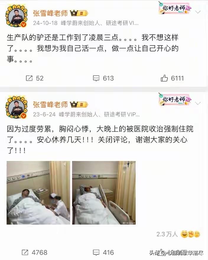 张雪峰老师指导和帮助了很多懵懂的学生,如何规划好人生的起步之路,但是对于他自己来说却唯独忽视了最重要的一课,那就是拥有一个健康的身体,才是人生最重要的事情! 原来张雪峰老师在2023年,就因为过度劳累,出现胸闷心悸,而住院治疗过,说明他的心脏可能本来就有问题,而且2024年看到他竟然熬夜工作到了凌晨三点,这也说明熬夜直播工作,对他来说已经是经常性的事情了,在加上他平时的精神压力也很大,饮食作息也不规律,谁的身体又能经得的住这样的透支呢? 如果说张雪峰老师,能够早点重视自己的身体健康的话,那么也就不会才年仅41岁,就这样突然离世吧?这么年轻有为的一位优秀老师就这样突然走了,真是太可惜了!