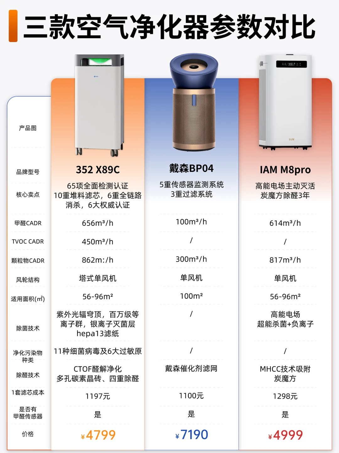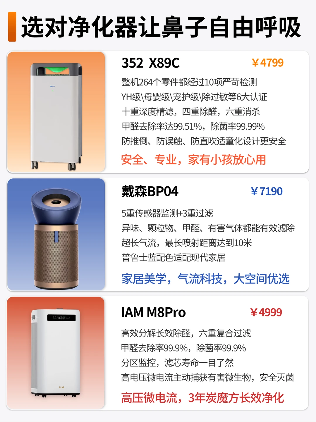 进入秋季,这几天天气忽冷忽热的还干燥,娇娇身边的uu们好多都中招感冒了🤧,家里有娃的宝妈们更是如临大敌! 秋冬本就是流感高发季,家里的空气质量真的不能忽视,一台好用的空气净化器就很有必要了,娇娇选了市面上3款热门的空气净化器,看看哪款更适合你家。 - 🍃325 X89C:安全、专业,家里有娃的选它 [星R]整台机器264个零件都经过10项严苛检测,用料非常良心。还有YH级、母婴级、宠护级、除过敏、睡眠静音+欧盟RoHS六大权威认证!在安全性上没的说。主打一个母婴专用,家里有宝宝的可以放心入! [星R]10重深度精滤技术,四重除醛+六重消杀,甲醛去除率达99.51%,除菌率高达99.99%,用上它,真的能安心住新家,也不用担心家里空气中的甲醛和病菌了,全家都能安心呼吸。 [星R]还有防推倒,防误触,防直吹的适童化设计,宝宝碰到了也不怕倒下;乱按不会触发;防直吹这块甚至能避免宝宝着凉! 每个细节都考虑到了,完美避开所有安全隐患。 [星R]睡眠模式下,噪音低至36dB,不用担心打扰宝宝睡眠了。 . 🍃IAM M8Pro:追求长效省心,厌烦换滤芯看这款 [星R]炭魔方滤芯,分区监控,滤芯寿命一目了然 [星R]独特的高能电场主动灭活技术,搭配MHCC技术吸附炭魔方,甲醛去除率99.9%,除菌率99.9% [星R]噪音控制在在29.7-66.4dB,静音效果很出色,不会打扰睡眠。 . 🍃戴森BP04:家居美学设计,大空间优选 [星R]10米超长锥形气流:0°/25°/50°可调角度,100㎡空间均匀送风 [星R]传感器监测+3重过滤,持续分解,异味、颗粒物、甲醛、有害气体都能有效滤除 [星R]普鲁士蓝配色,美商满分,夜间模式38dB,能当风扇使。 三款比较下来,如果是追求综合性能、尤其看重除醛除菌、家有宝宝/宠物,且希望安全省心,那非常推荐352 X89C。