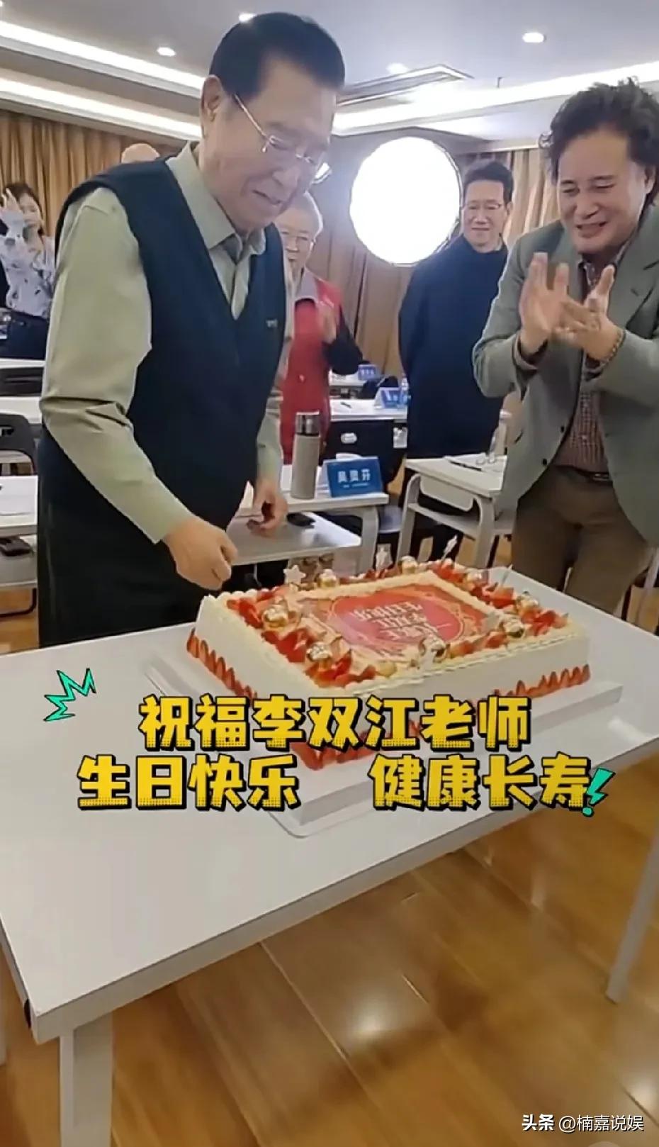 著名的男高音歌唱家李双江,87岁生日,他的学生和圈子里的好友现身为他庆祝。 他穿着一件绿色长袖军衣配针织背心,戴着老花镜,身形有点弯,头发染成了黑色,看着精神不少。 桌子上摆放着一个蛋糕,上面写着: 一代歌王,李双江 ,生日快乐🎂 徒弟戴玉强帮着切蛋糕,老婆梦鸽在一旁唱生日歌,为他庆祝。 画面看着挺温馨的,李双江自己心情也挺好的,。自从小儿子出来后,他的状态明显比以前好多了。