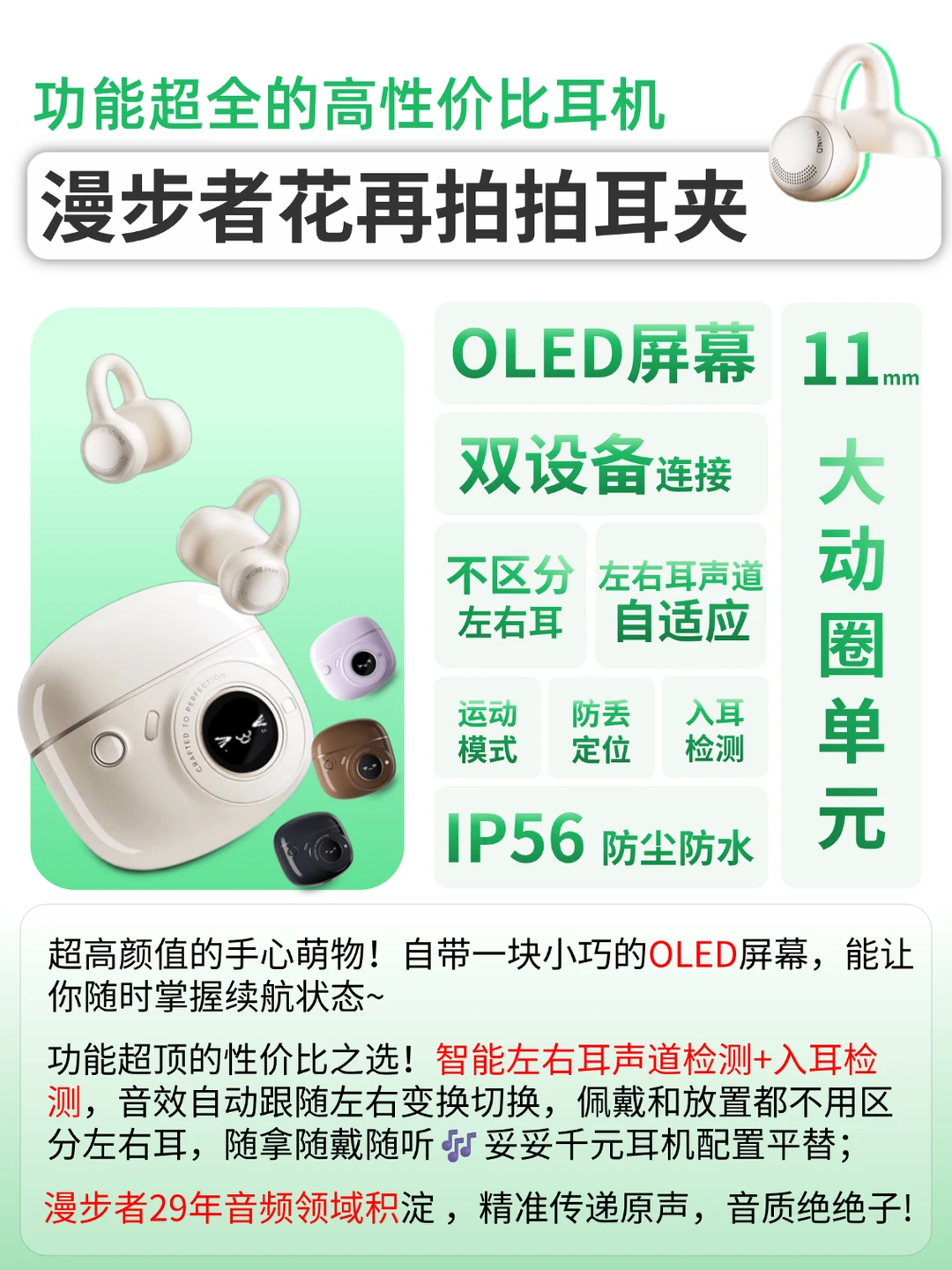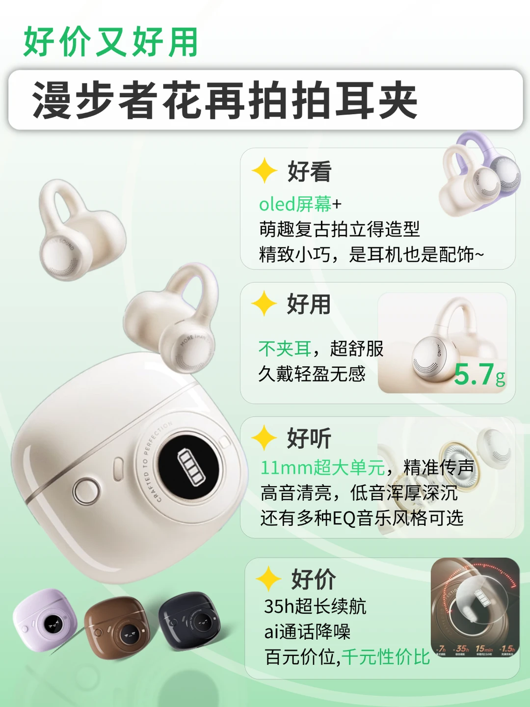 [一R]复古拍立得设计外观,oled屏幕,可随时查看电量,还有可爱萌态表情,耳夹颜值高,戴起来像耳饰