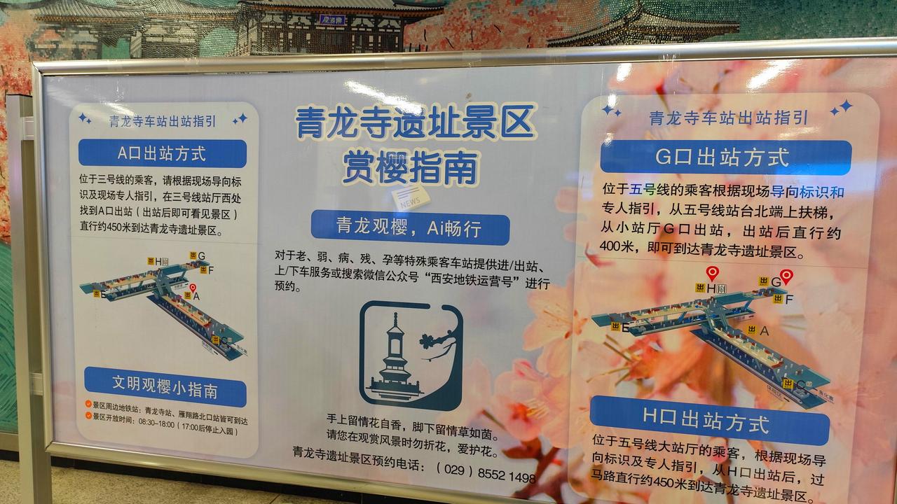 青龙寺的樱花开了,值得专门跑一趟吗?别急,跟着本账号的镜头,带你先睹为快👀刚到青龙寺地铁站,一出闸机就被整整齐齐的赏樱指引震住了——路面指示标、赏樱路线图、交通导览牌,一路铺到出站口。现场还有工作人员值守,随时解答问题。 地铁这波操作,真的是把“贴心”打在公屏上💯目前早樱已进入观赏期,垂樱初绽,枝头粉白相间,微风一吹,花瓣轻摇,氛围感直接拉满。建议赶早来,人少光线好,出片率更高📸。记得提前预约,并带上身份证,刷卡即可进入。 📍交通:地铁3号线/5号线青龙寺站G口出,步行约5分钟即达 🎫门票:免费,可提前在官方平台预约 🗓️最佳观赏期:3月下旬至4月上旬