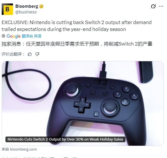 据彭博社独家报道,任天堂将削减Switch 2的产量,原因是2025年底假日季的需求低于预期。有消息人士透露,任天堂计划在本财季将Switch 2的产量削减约30%,从600万台降至400万台。消息人士指出,此举主要是由于Switch 2在美国假日季的销量不达预期,以及对该平台的独占新作能否支撑更高产量的担忧。