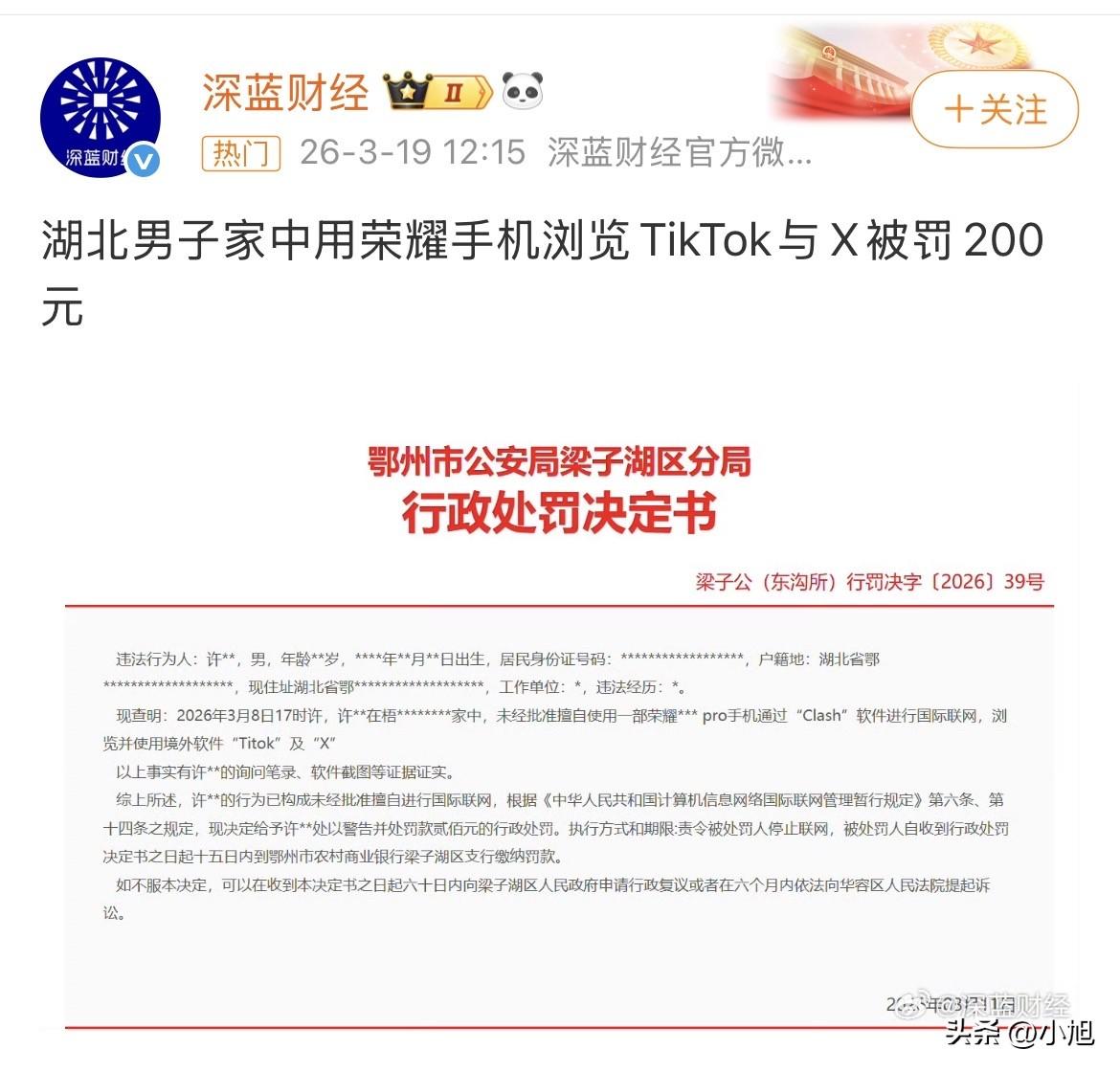 3月8号下午5点,湖北鄂州一个男的在家刷手机,被罚了200块。 这个时间点很具体,傍晚5点,不是半夜偷偷摸摸,是正常下班在家的时间。 处罚决定书是3月11号出的,现在还在湖北公安执法公开平台上挂着。 他用的是一部荣耀手机,装了个叫“Clash”的软件,连上了TikTok和X。 文书上写得清清楚楚:浏览并使用。没有发帖,没有评论,没有转发,就是自己看。 证据有两样:询问笔录和软件截图。 软件截图怎么来的?要么是手机被查了,要么是技术手段直接抓到的。 现在运营商的数据和公安是通的,VPN的连接特征、加密流量,都能识别出来。 这件事最让人琢磨的地方,不是罚了多少钱,而是文书最后那句话:“责令被处罚人停止联网”。 注意这个词,不是“停止翻墙”,是“停止联网”。 这意味着,从现在开始,这个人连国内网都不能上了。 处罚依据是1996年发布的《计算机信息网络国际联网管理暂行规定》第六条和第十四条。 第六条说:必须使用邮电部国家公用电信网提供的国际出入口信道,任何单位和个人不得自行建立或者使用其他信道进行国际联网。 第十四条说:违反的,由公安机关责令停止联网,给予警告,可以并处15000元以下罚款。 这里有个细节——邮电部在1998年就被撤销了。 也就是说,现在管着这件事的法律依据,是一个已经不存在了的部门定下的规矩。 1996年的时候,大部分人还不知道互联网是什么,更别说翻墙了。 将近三十年过去了,这条规定一个字没改,还在用。 200块钱是罚款里最轻的一档,按照规定最高能罚15000。 这说明执法部门也知道,这个人的行为没有造成严重后果,就是自己看看。 罚200块,更像是一个提醒:这件事,我们知道,但这次轻罚,下不为例。 问题在于,这个“批准”从哪里申请?普通人压根没地方去办这个手续。 法律说“未经批准”是违法的,但“批准”的通道根本不存在。 这就成了一个没法合规的事。想合规,没门;不合规,随时可能被罚。 3月8号下午5点,许某在家刷手机的那十几分钟,可能根本没想到,这一刻会被记录下来,成为一份公开的法律文书。 那份文书上,他的名字、住址、用的什么手机、几点几分在干什么,都写得明明白白。 罚单已经开了,钱也交了,但他可能到现在都没想明白——看个短视频而已,怎么就违法了呢? 你怎么看这件事? 来源:湖北公安执法公开平台 梁子公(东沟所)行罚决字〔2026〕39号