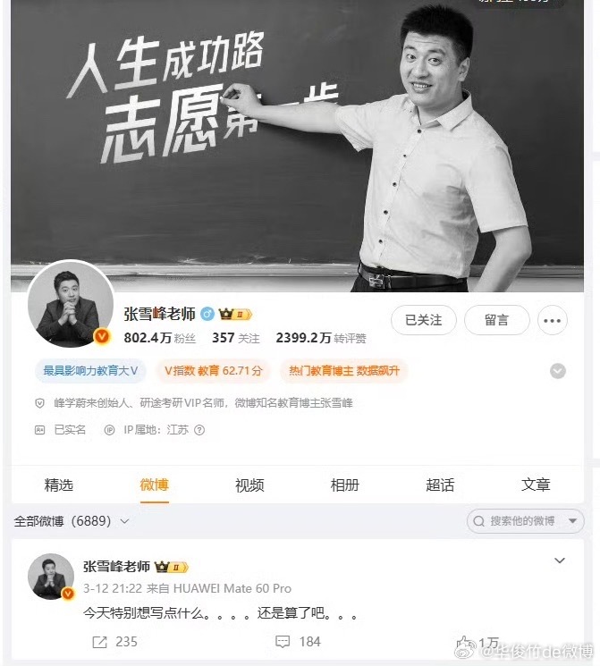 而且过了这么久,张雪峰还没有出来回应,让人真的不得不往那边想,但其实我们都希望这件事是假的,张雪峰其实帮助了不少学生,真的希望他没有事,早点出来澄清。