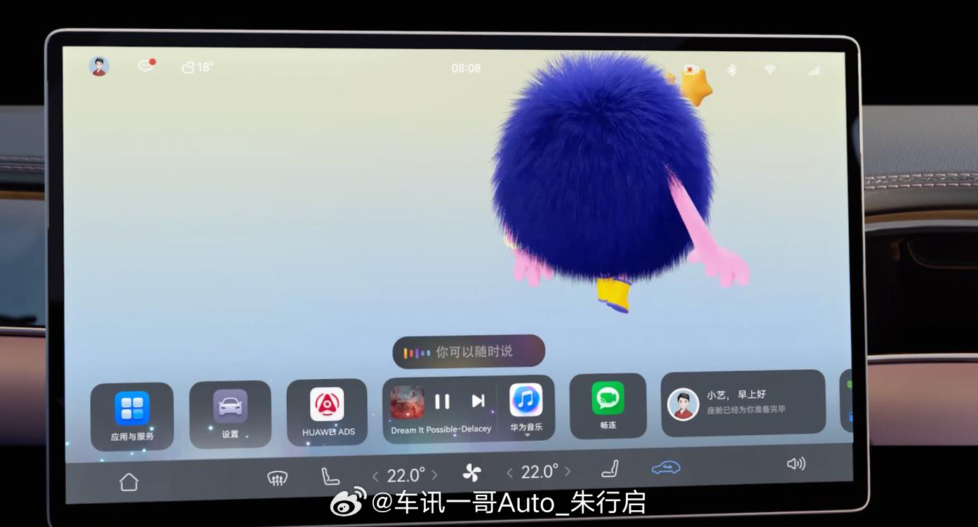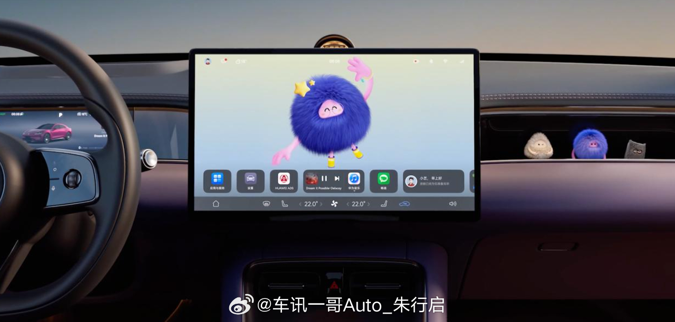 内饰方面,新车配备三辐式方向盘、悬浮式中控屏、怀挡式换挡杆等,新车首发随动四维屏,支持前后伸缩和左右旋转,可自动转向、智能迎宾,呼叫小艺即可转向应答。