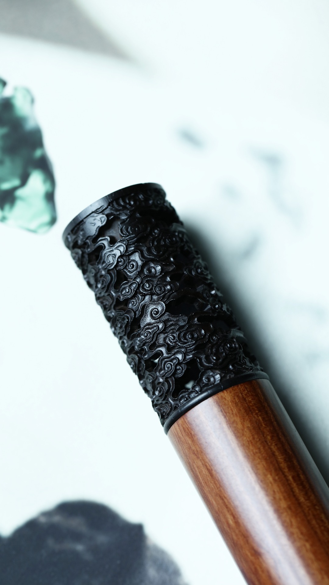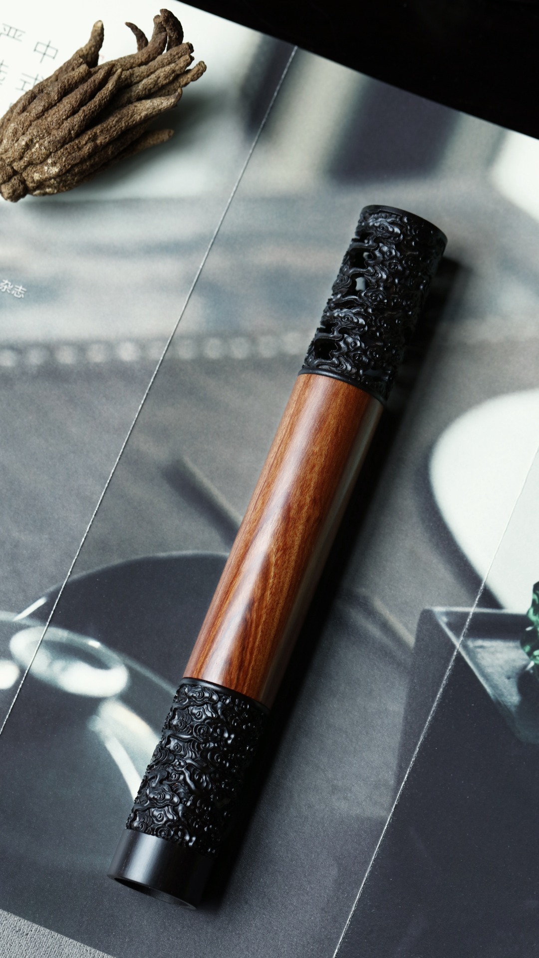 如意金箍棒·香筒油润老料制,紫光檀满工精雕祥云纹,腰身镶嵌非洲酸枝,立形新颖。案