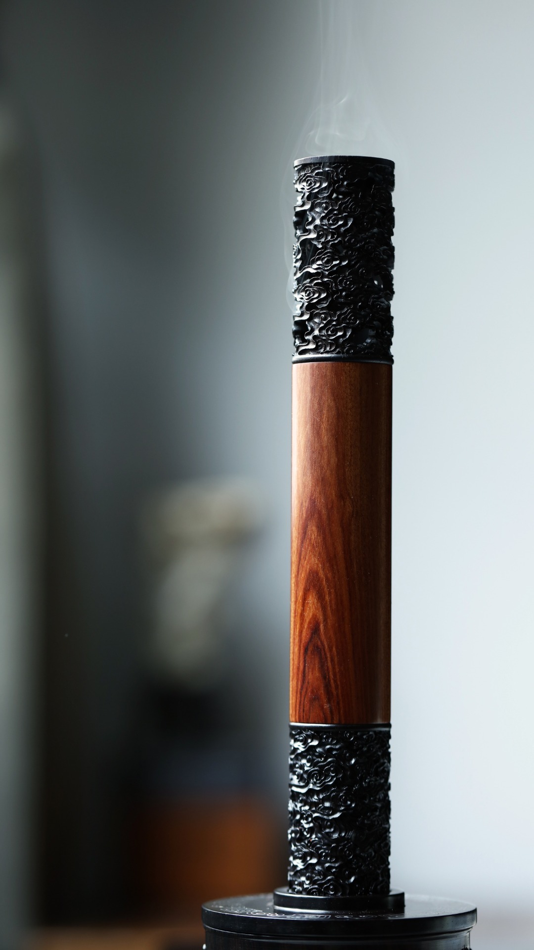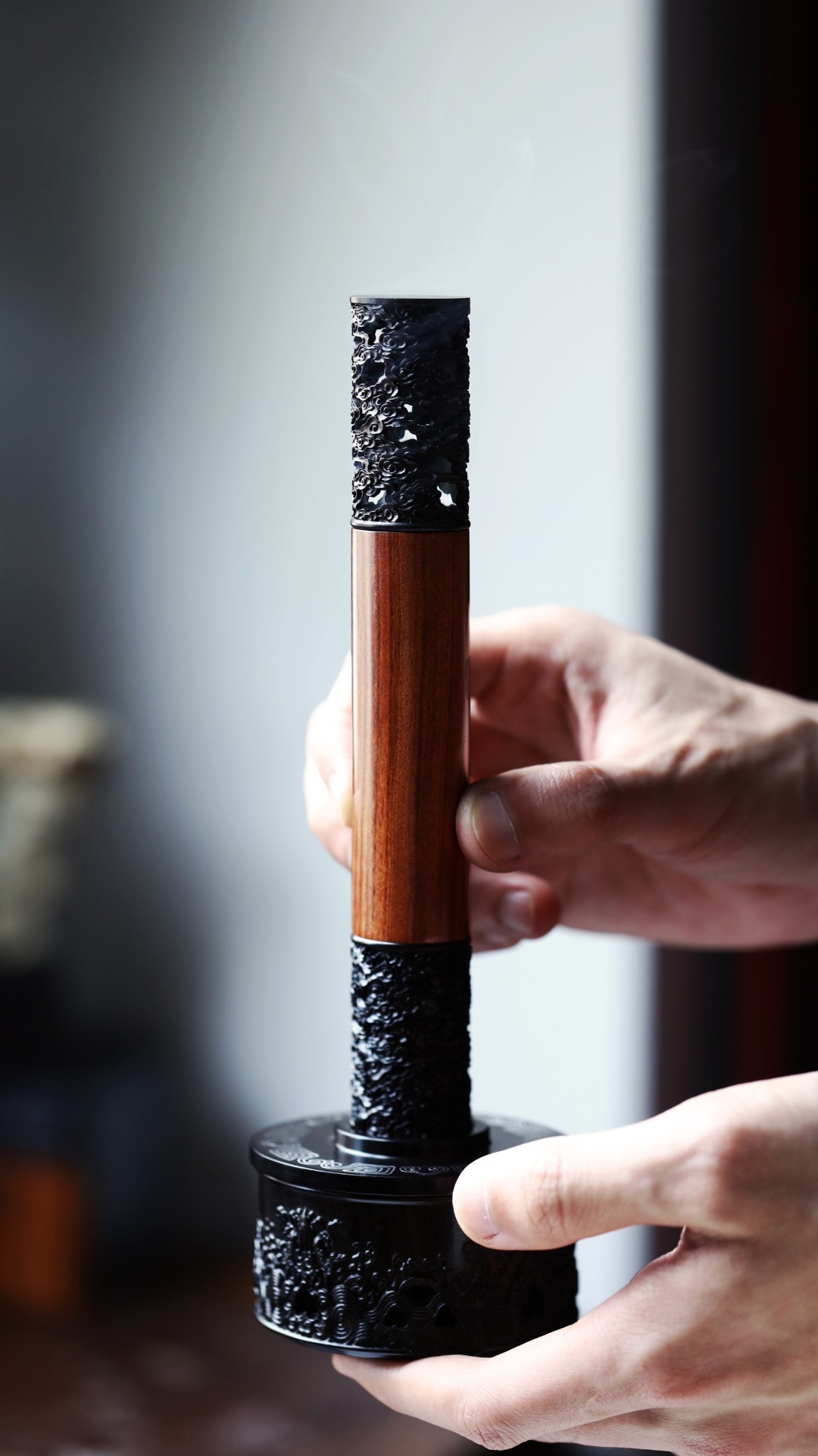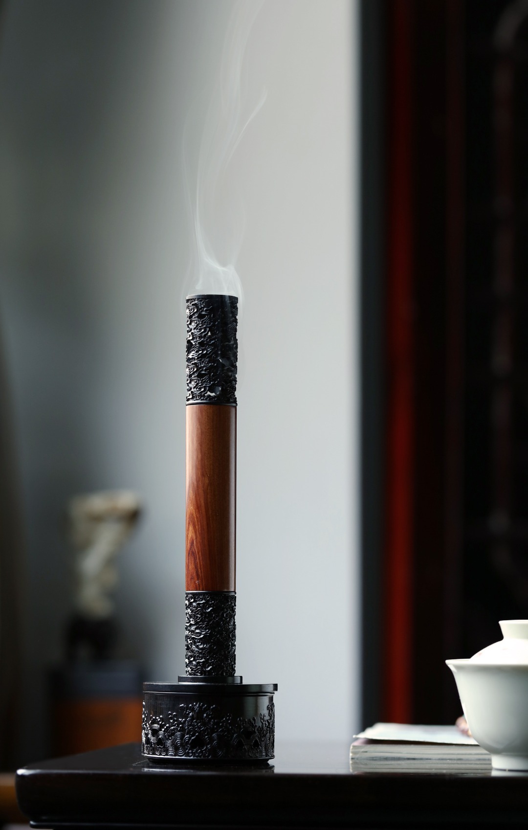 油润老料制,紫光檀满工精雕祥云纹,腰身镶嵌非洲酸枝,立形新颖。案头燃香伴青烟缭绕流转,线香、盘香皆可,气韵清逸脱俗。