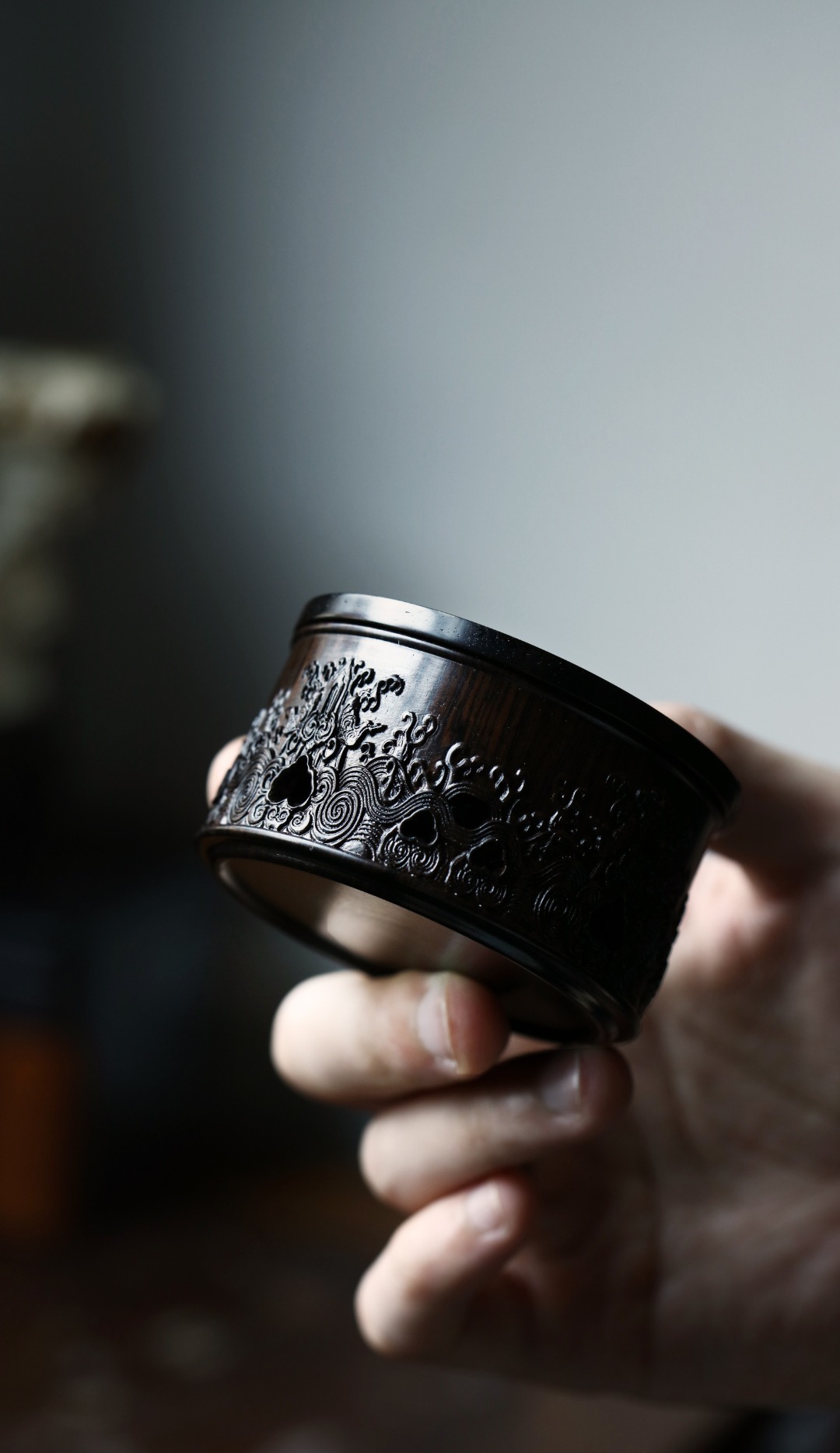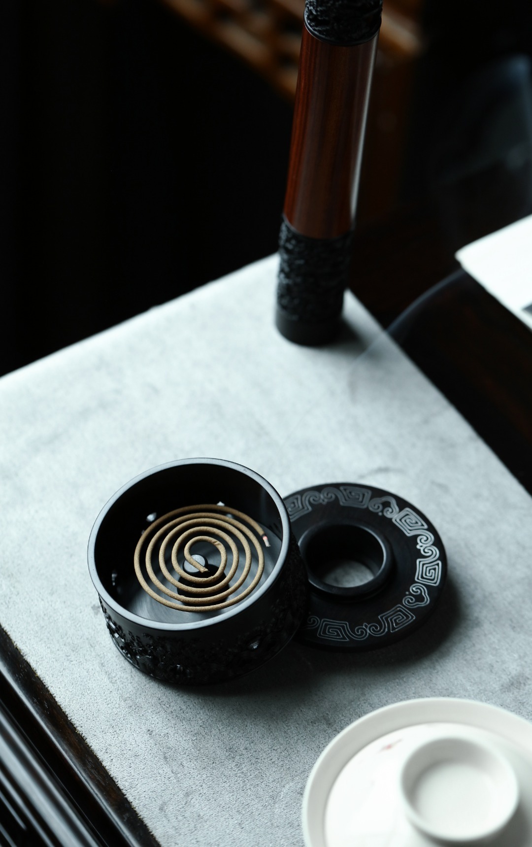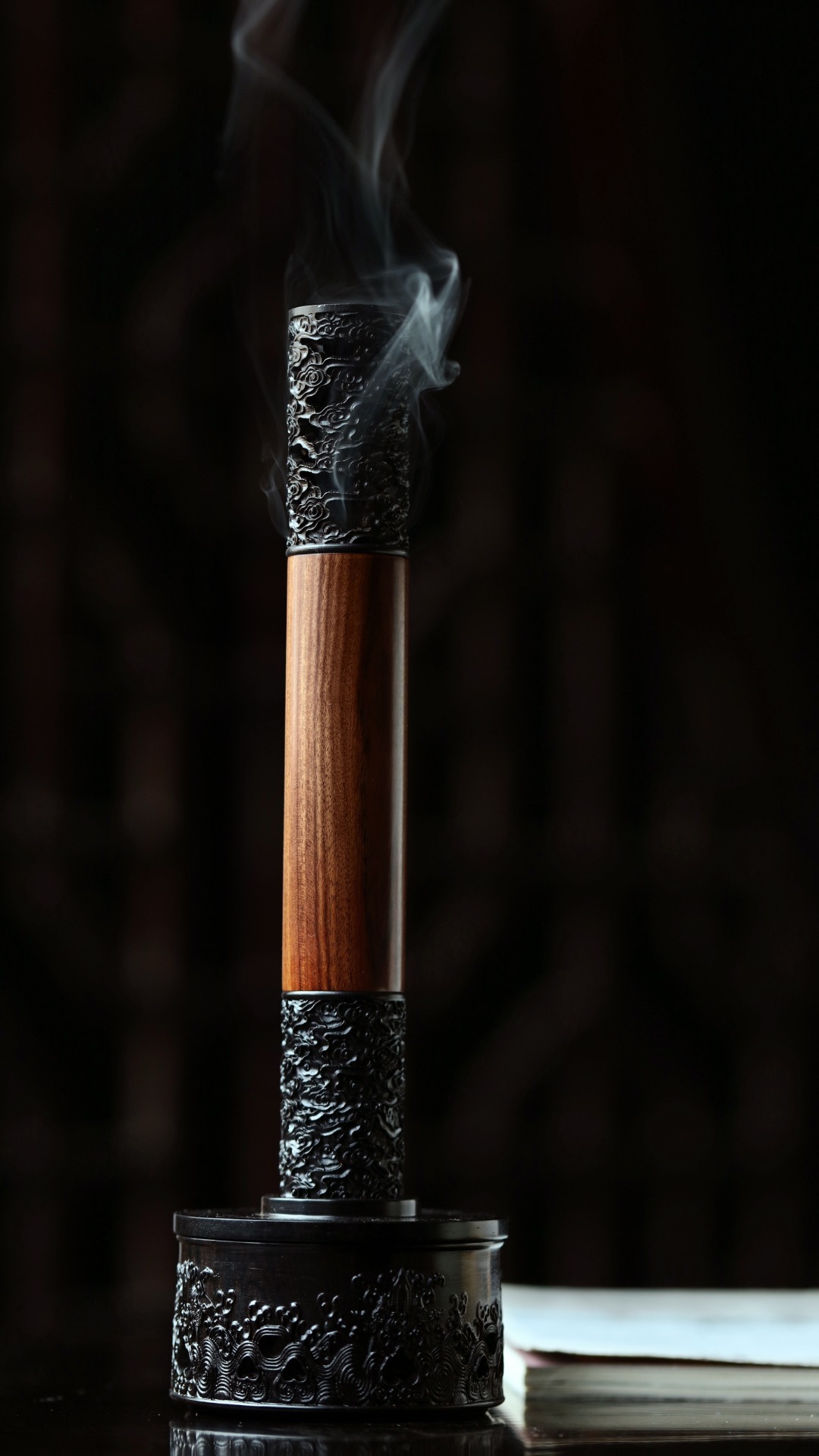 油润老料制,紫光檀满工精雕祥云纹,腰身镶嵌非洲酸枝,立形新颖。案头燃香伴青烟缭绕流转,线香、盘香皆可,气韵清逸脱俗。