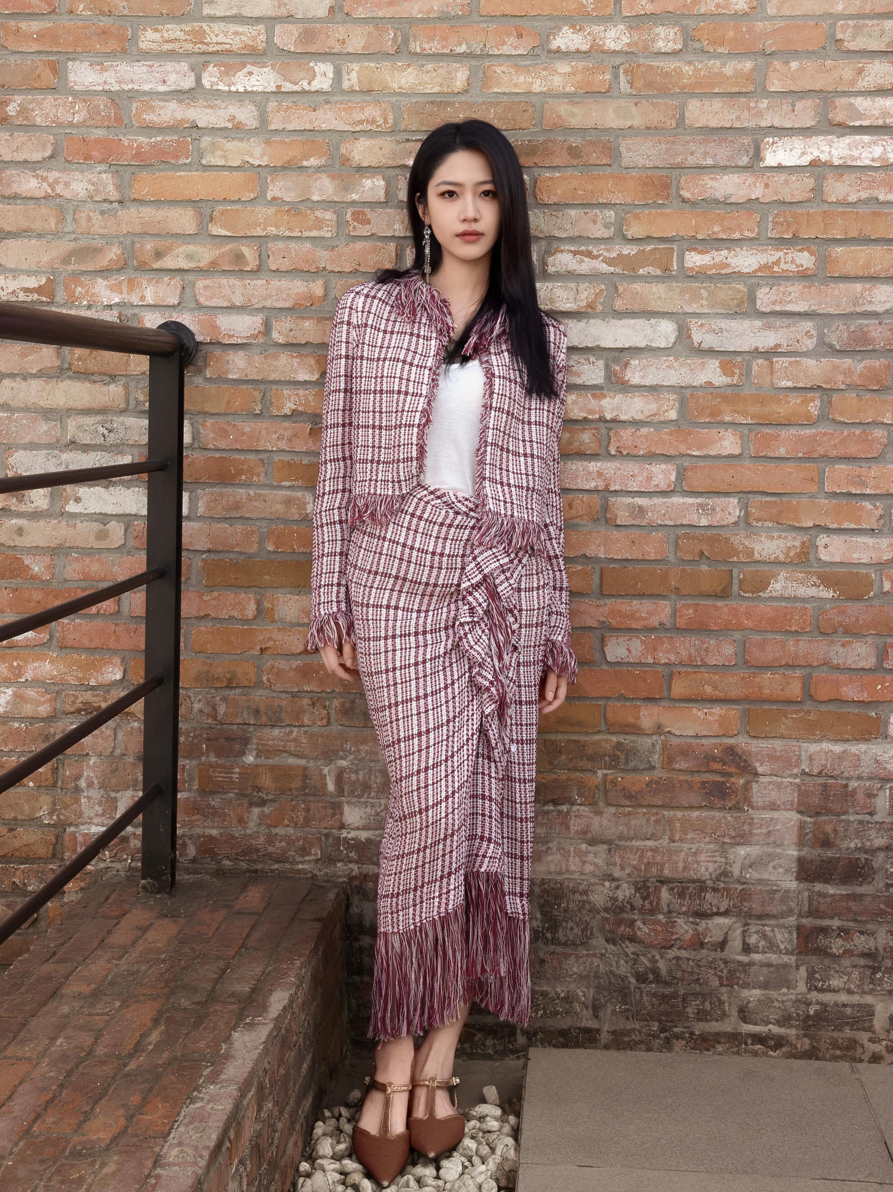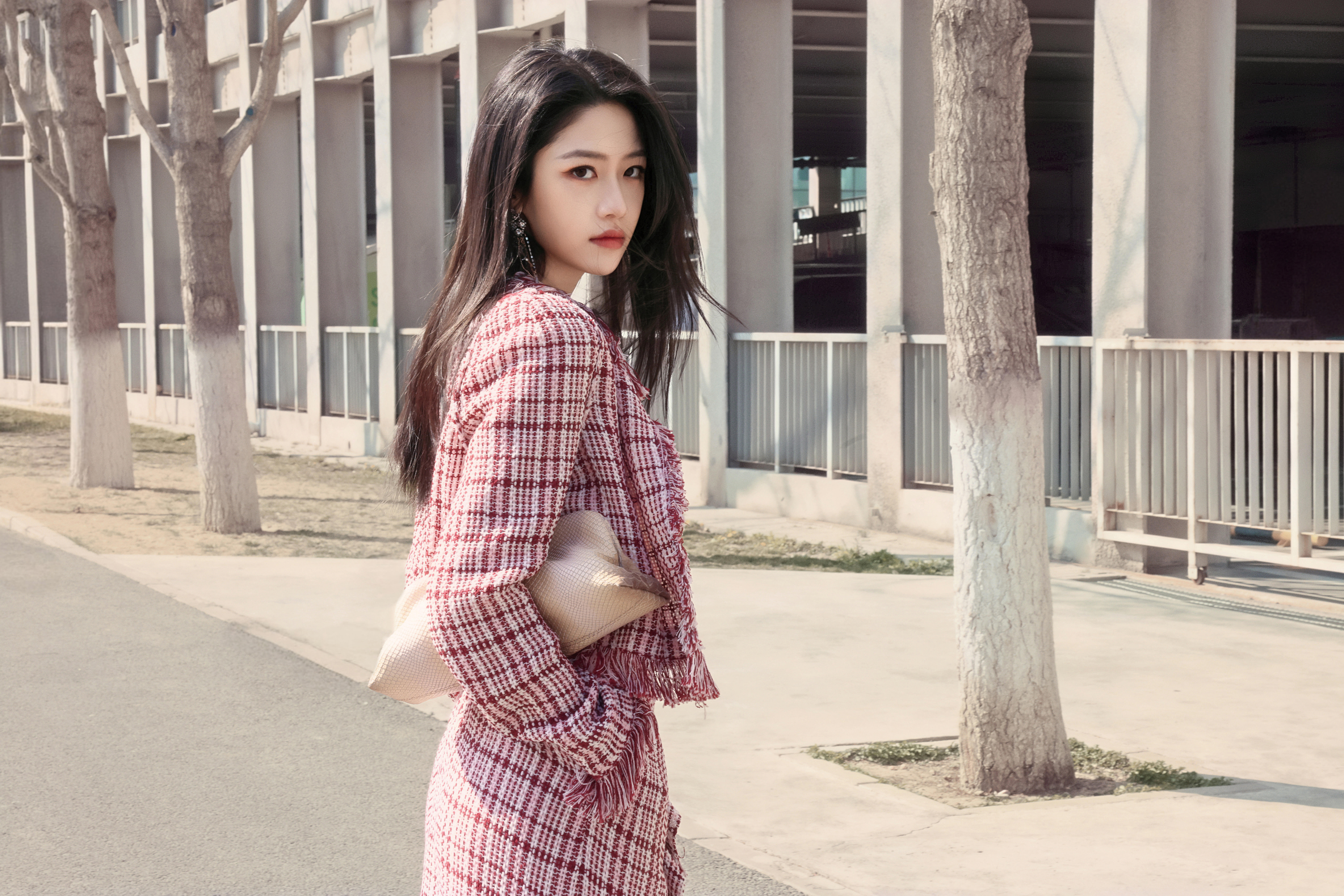 杨紫浅粉衬得肤色透亮,酒红发丝垂落,薄纱裙摆若隐若现,铆钉高跟鞋是点睛之笔。