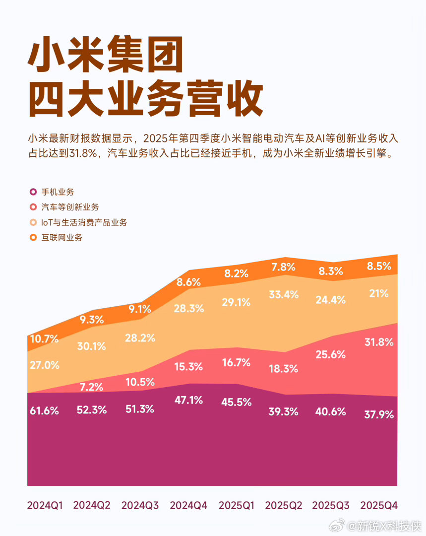 我觉得最关键的变化就是小米不再只依赖手机业务。汽车入局没多久就年收入破千亿,还实现了盈利,季度占比接近三成,确实帮集团分散了不少行业风险。