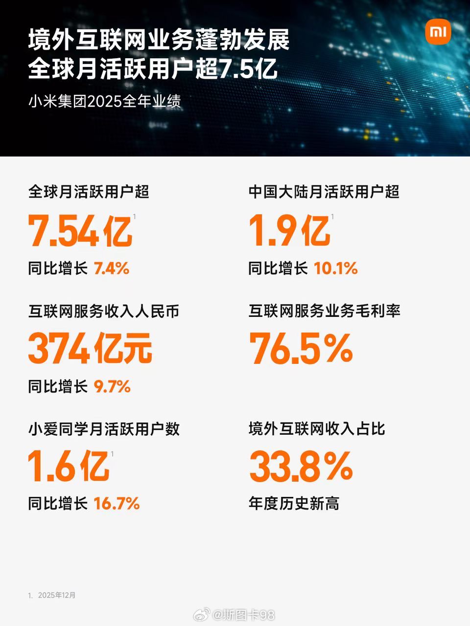 汽车业务表现堪称惊艳,年营收首次突破千亿达1061亿元,季度营收占比超三成,强势成为集团增长引擎。跨界造车不到两年,2025年新车交付超41万辆,规模与增速双爆发。更实现年度经营收益9亿元正式转正,从高速扩张迈向健康盈利,成长势能强劲。小米2025年研发投入接近全年利润