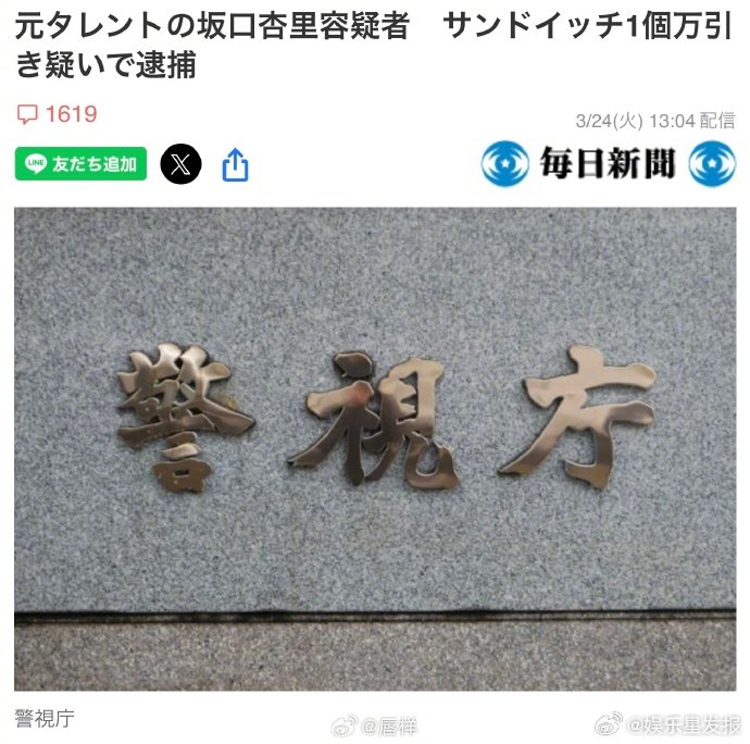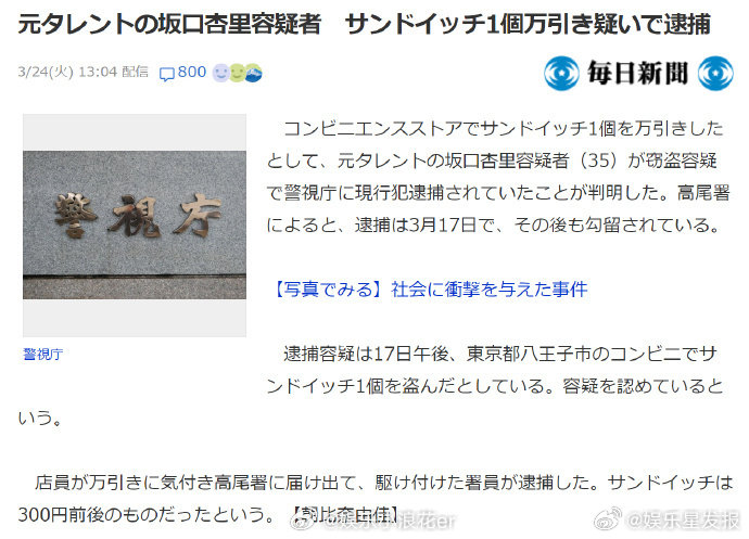 日本艺人便利店偷三明治被被捕据悉,前艺人坂口杏里因涉嫌在便利店偷窃1个三明治,被警视厅以盗窃嫌疑现行犯逮捕。据高尾署消息,逮捕时间为3月17日,目前其已被拘留。17日下午,坂口杏里在东京都八王子市的一家便利店盗窃了1个三明治,坂口已对嫌疑供认不讳。店员发现其偷窃行为后向高尾署报案,赶到现场的警员将其当场逮捕。被盗三明治价值约300日元(≈13.03元人民币)