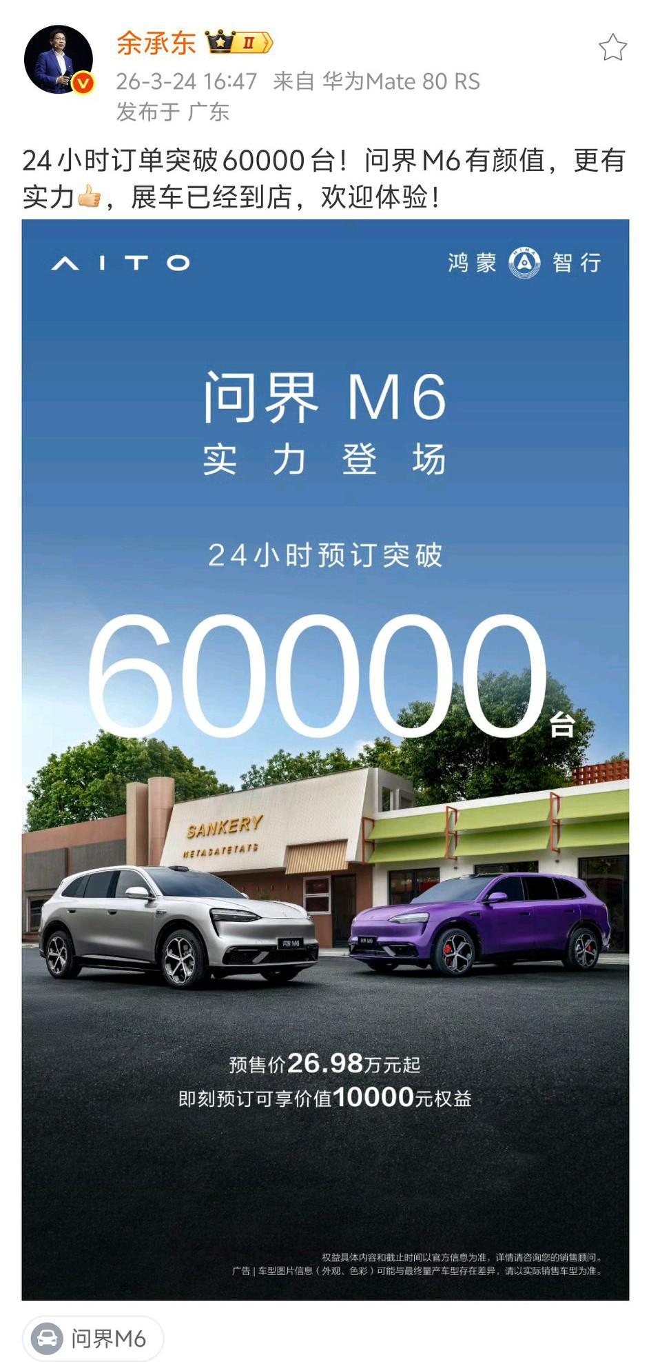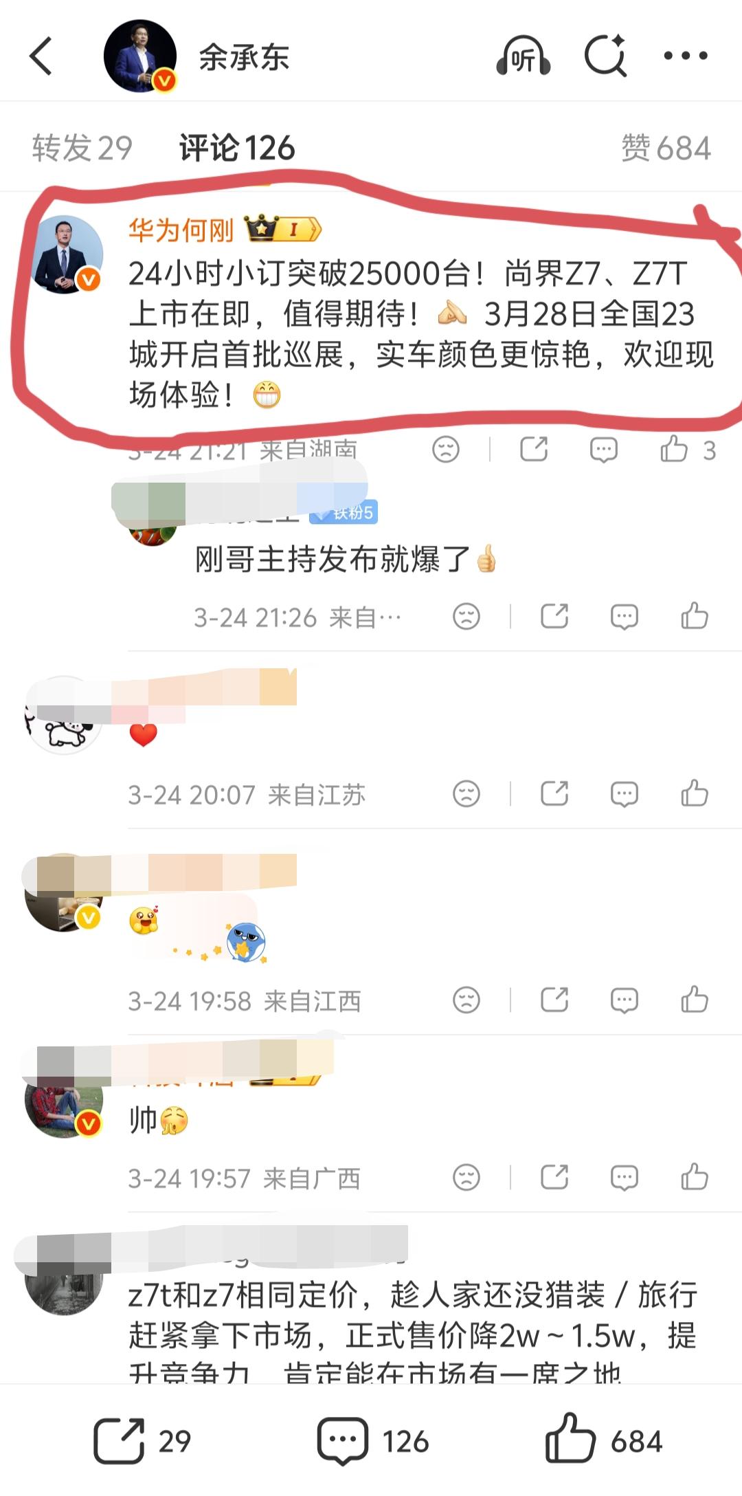 尚界双7预售开门红,余承东和何刚在微博上一唱一和太凡尔赛了。 先是余承东在3月24日19:53发微博动态报喜,他说,尚界Z7、Z7T 两款车 24小时小定订单合计已经突破 25000台,欢迎大家到店亲自体验。 紧接着, 何刚于21:21现身余承东微博评论区留言表示,Z7和Z7T很快就要正式上市,3月28日会开启全国巡展,实车体验会更震撼,并让大家一起期待。 我感觉何刚对尚界双7订单表现的紧张程度一点都不比余承东少,因为,当天余承东因为身体原因无法亲自上台讲解,后来委托何刚全程主讲鸿蒙智行的新车预售内容,包括尚界Z7和Z7T、问界M6的新车预售,还有享界双9、智界双7、问界M7和M8六款在售车型的焕新发售,全部交由没讲解过汽车业务的何刚来完成。当时,临阵上场的何刚虽然发挥很稳,也没有什么出错的地方,但很多人还是将何刚的讲解拿来跟余承东的风格进行一番比较,认为缺少了余总的激情和爆发力。 现在订单表现出来了,儒雅随和的何刚不辱使命,不仅尚界双7订单可圈可点,问界M6预售24小时订单更是突破了60000台。 其实吧,华为896线激光雷达的产品力就摆在那里,大家都知道它的含金量,所以,尚界Z7和Z7T以及问界M6都不会因为换了个主讲人就不发光。当然,如果是余总亲自上阵的效果会更好,但现在也不差啊,展车到店后,试驾一铺开,惊喜还在后头。华为入局智驾的鲶鱼效应 鸿蒙智行 尚界Z7 尚界z7猎装版 尚界Z7T 尚界Z7轿跑