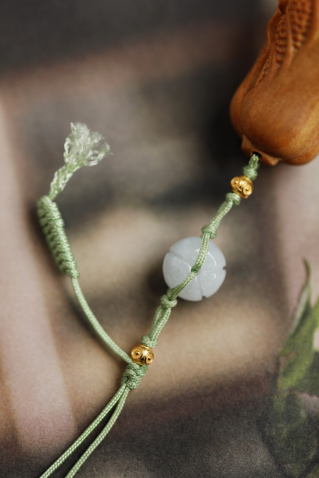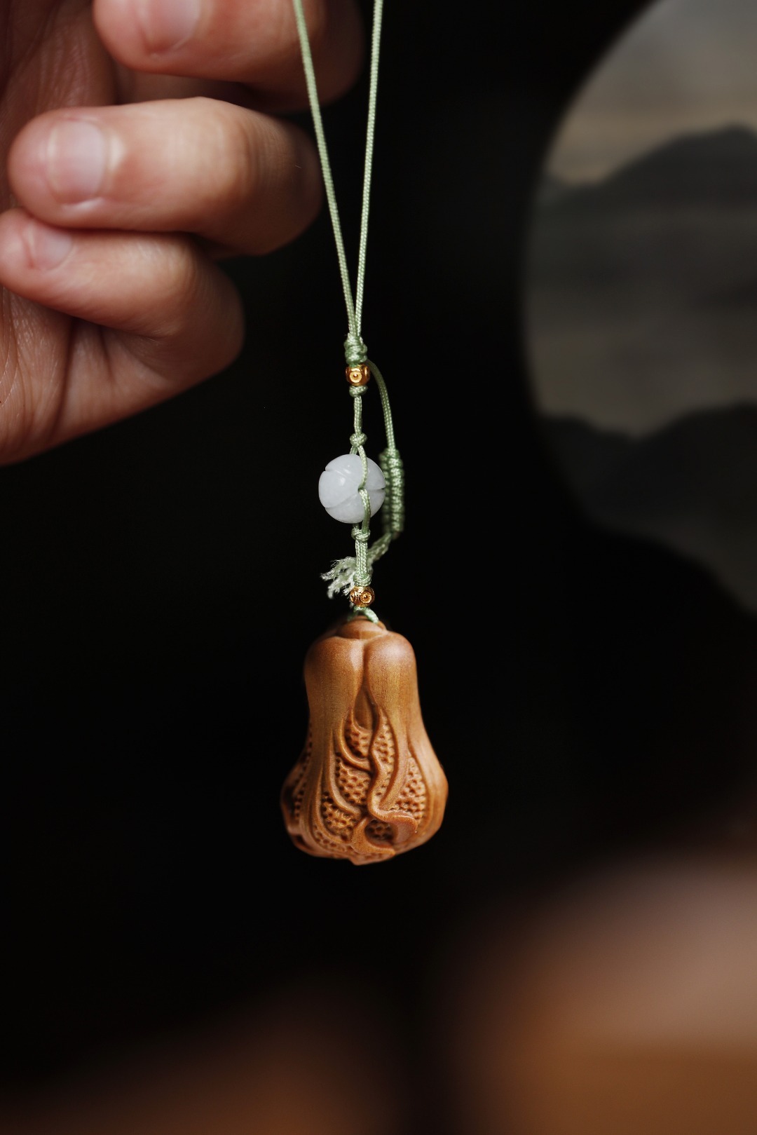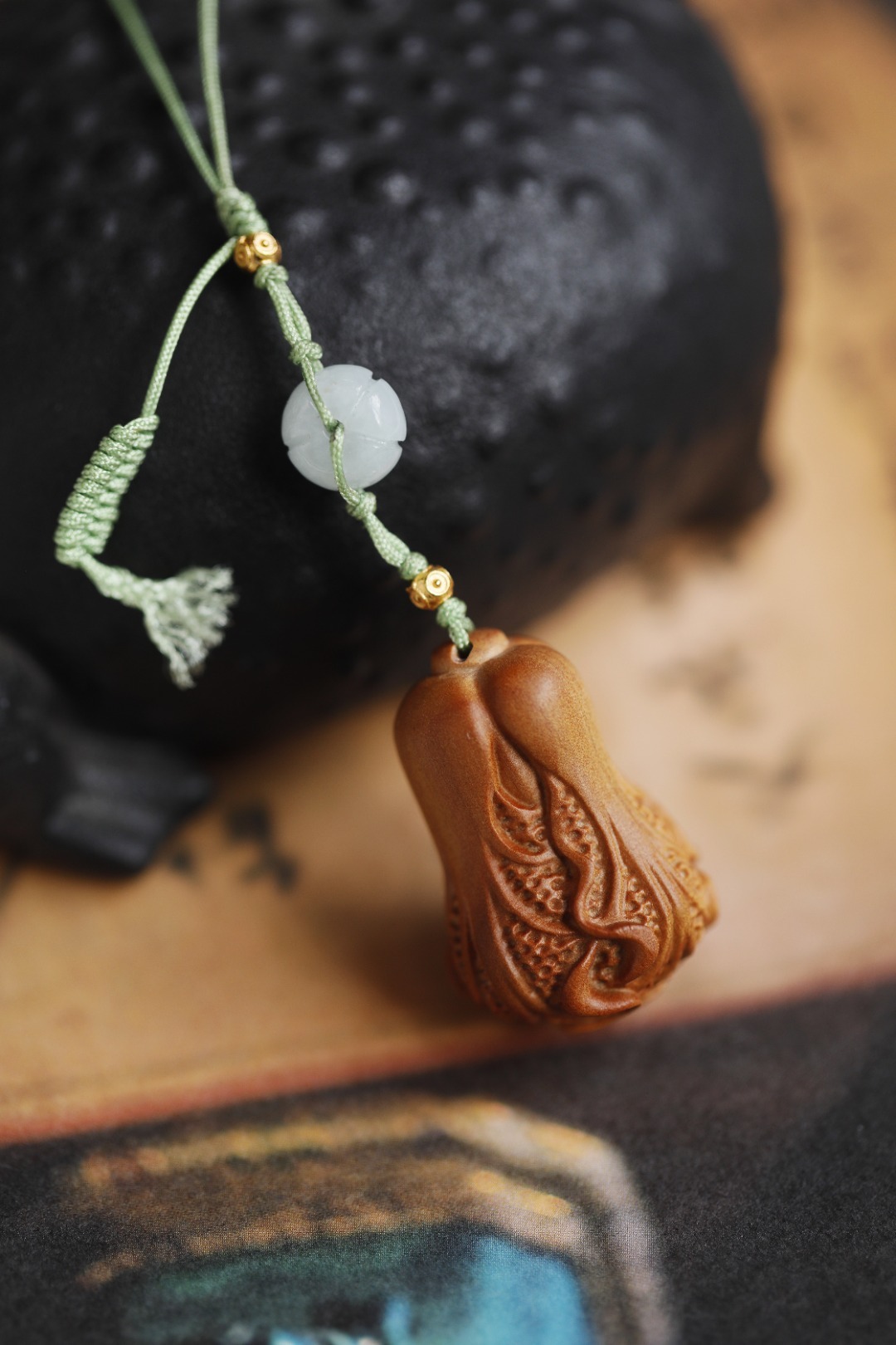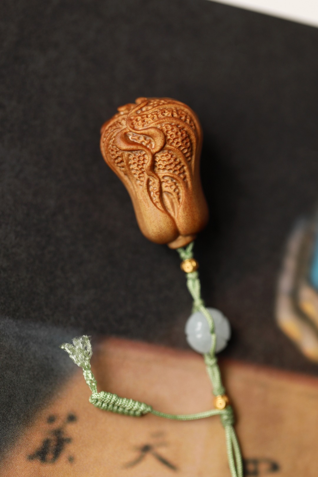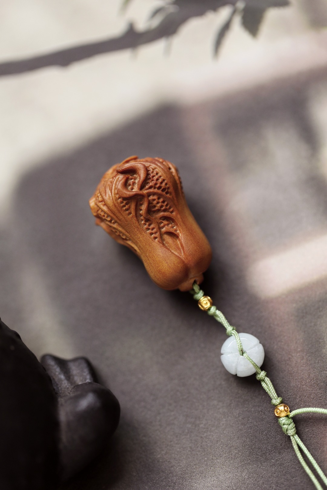 老山檀香光滑、致密,香气醇正,雕饰小白菜,寓意百财聚来,观之有趣,玩之怡然。