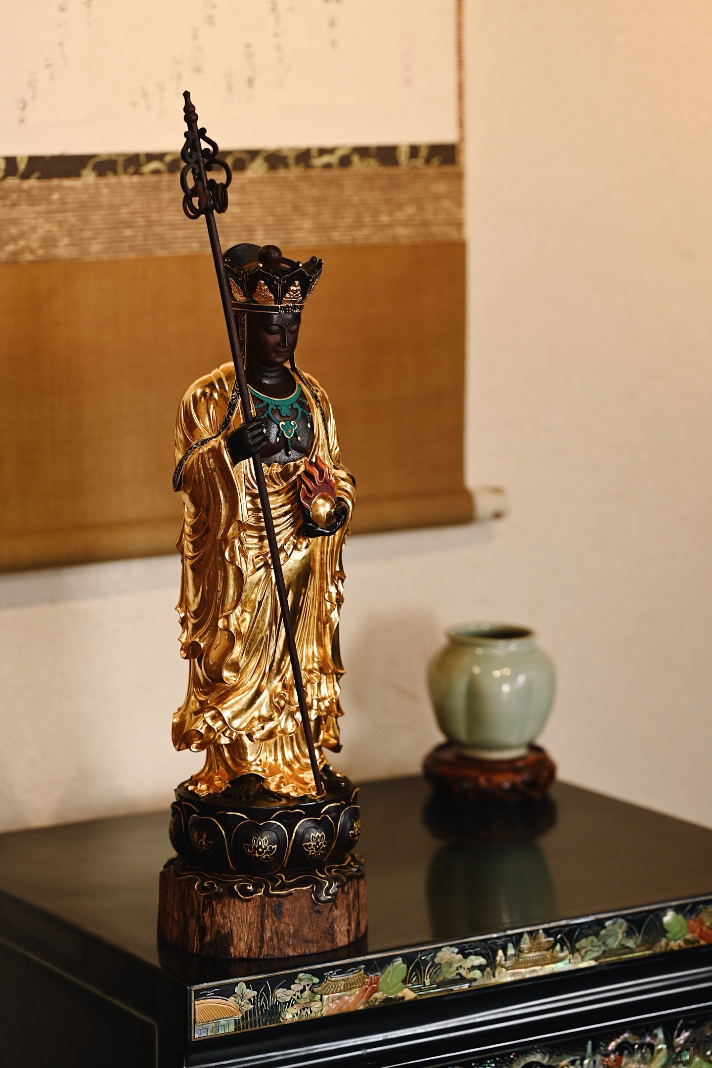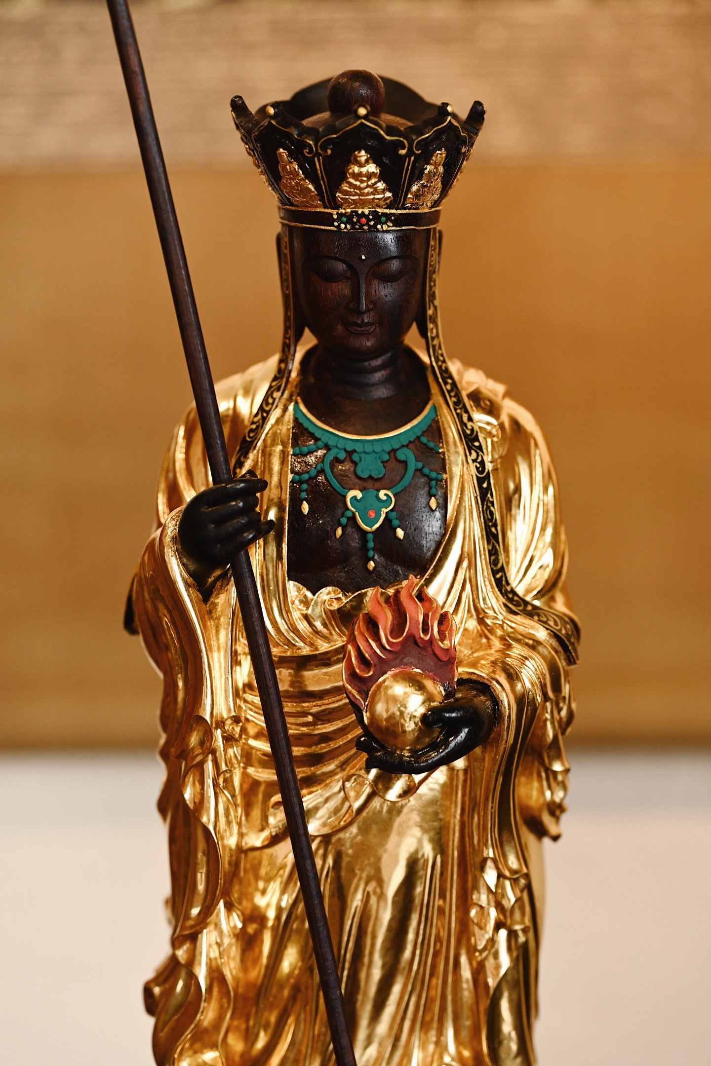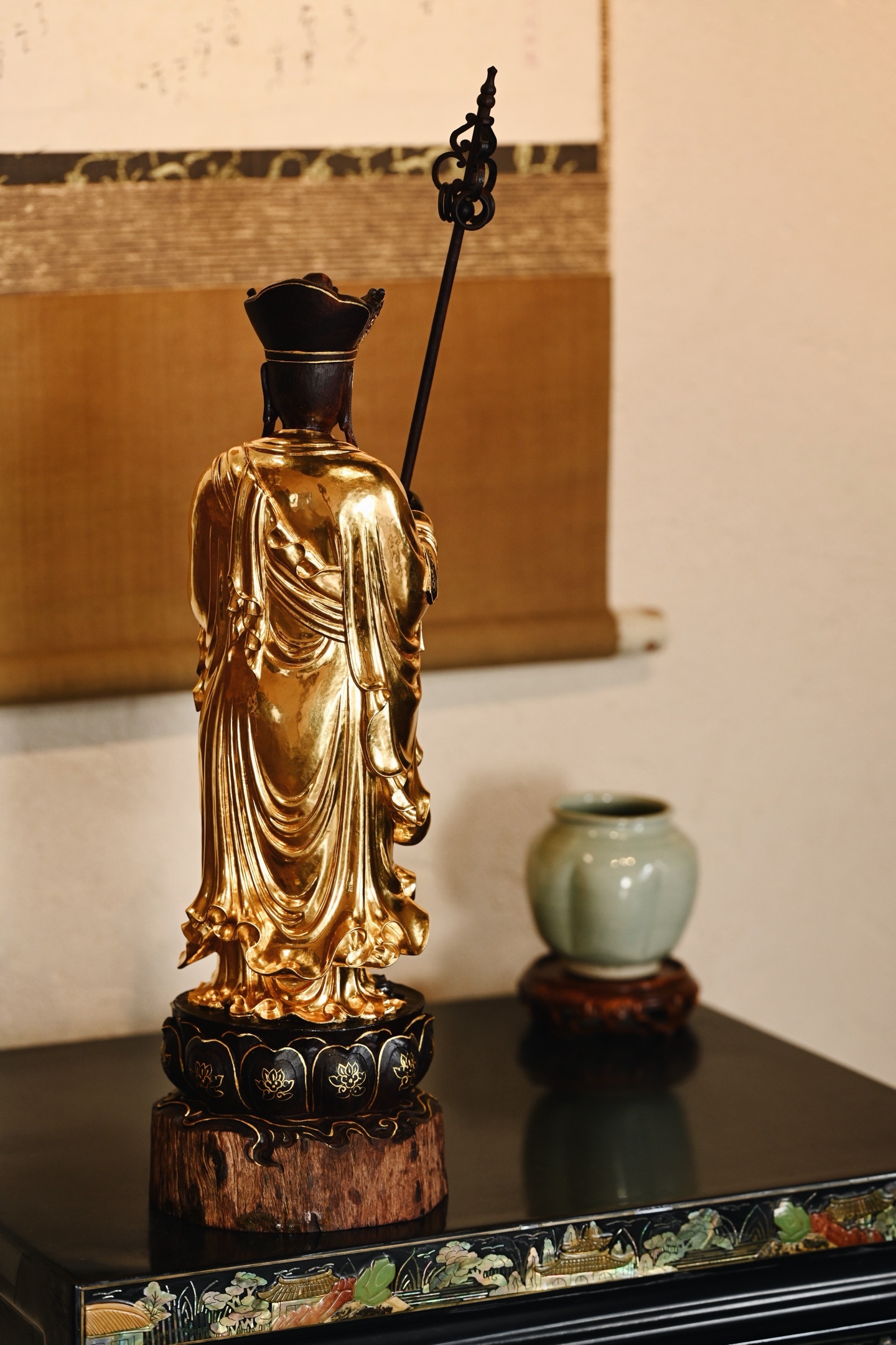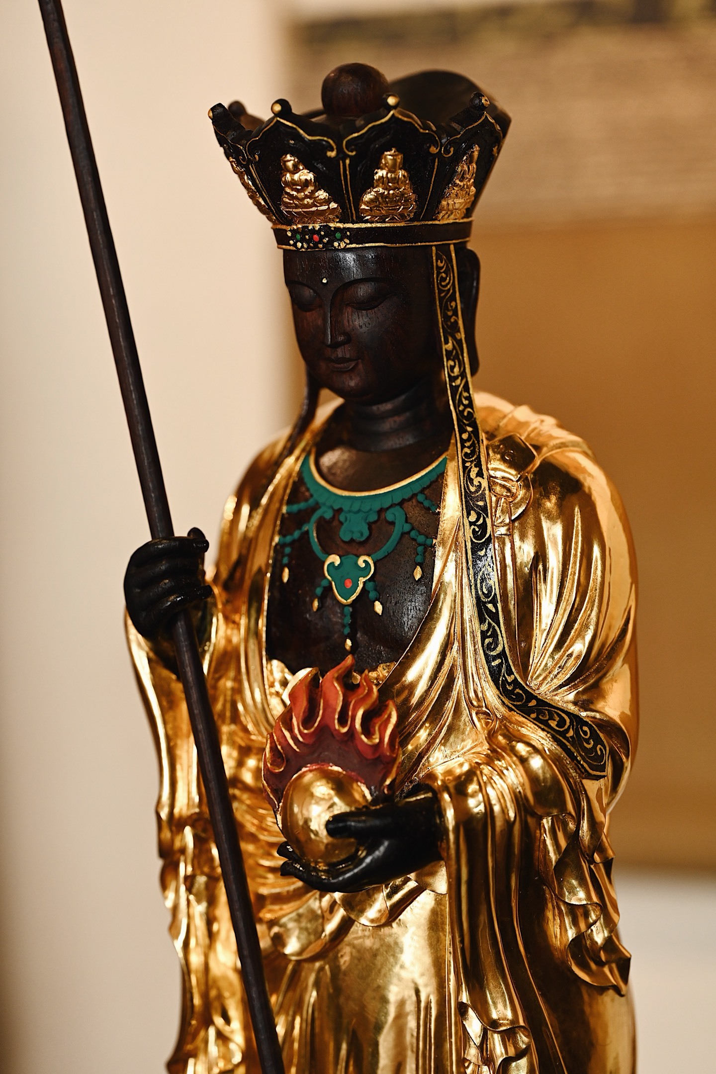 整料雕刻,以木为胎,髹金敷彩,宝相庄严。菩萨头戴五佛冠,手持锡杖与火焰宝珠,衣袂鎏金垂落,莲座描金缀纹,色彩华贵而不失清寂,整体气韵慈悲肃穆。