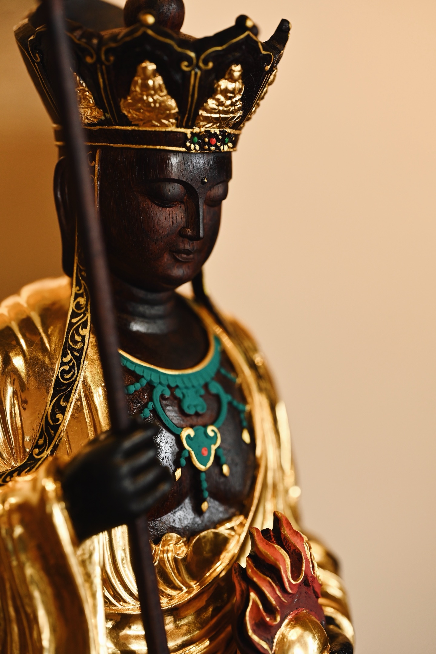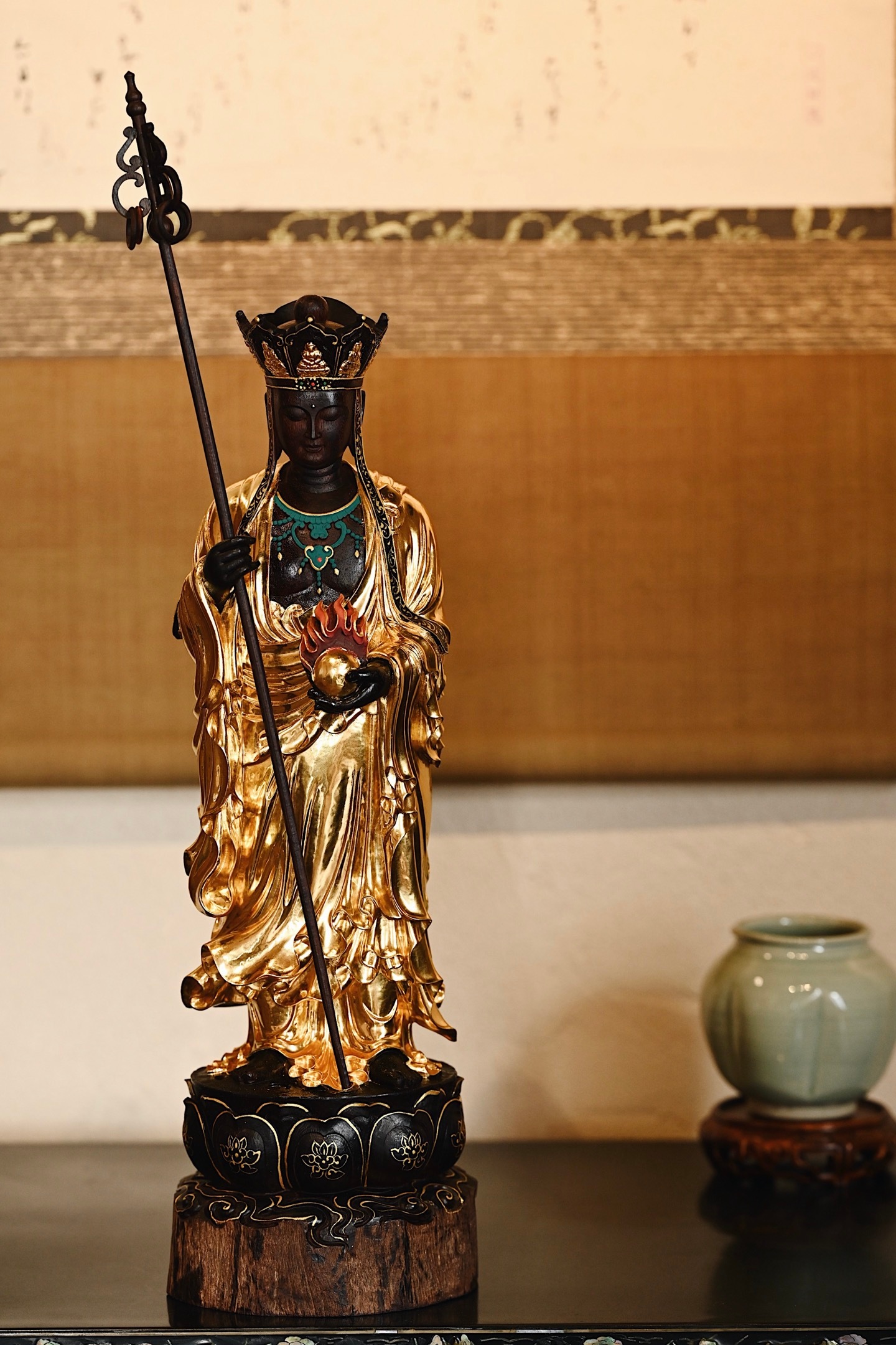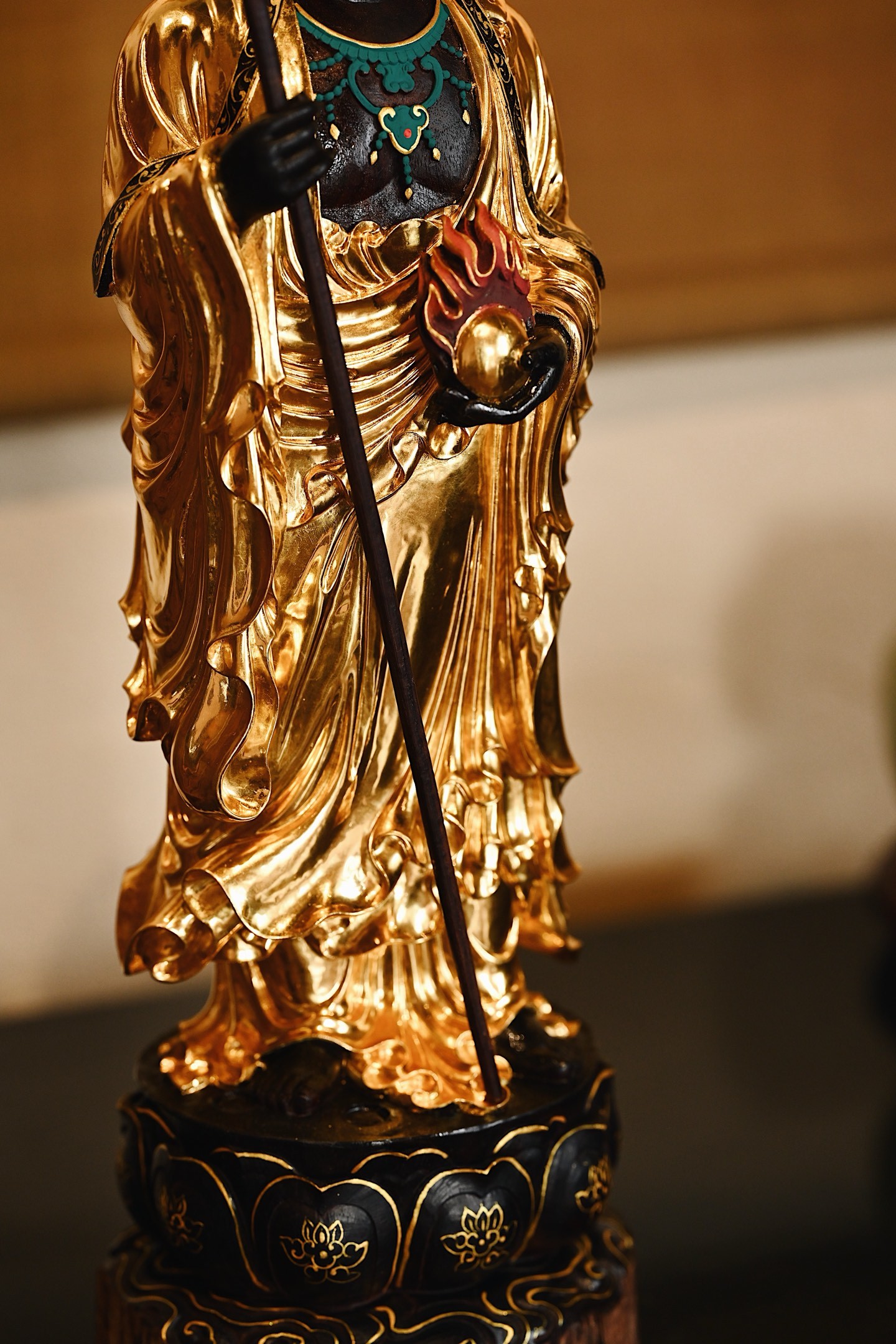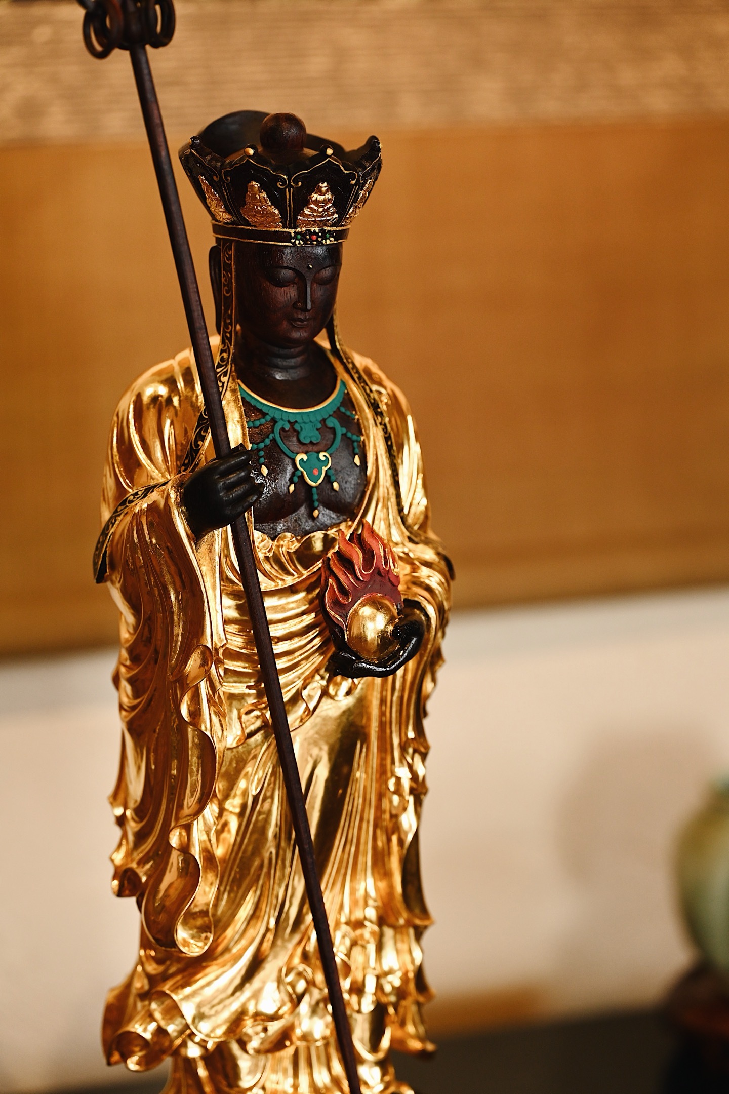 整料雕刻,以木为胎,髹金敷彩,宝相庄严。菩萨头戴五佛冠,手持锡杖与火焰宝珠,衣袂鎏金垂落,莲座描金缀纹,色彩华贵而不失清寂,整体气韵慈悲肃穆。