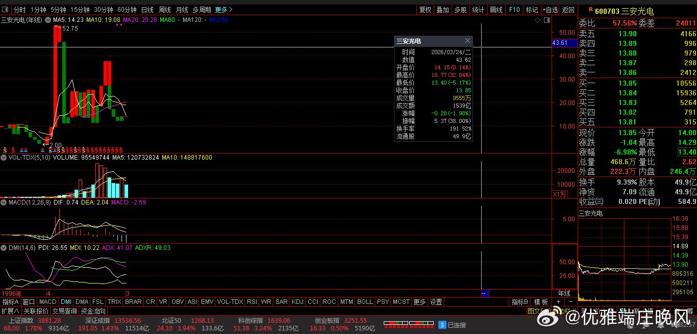2、600703 三安光电 13.85 -6.98% -8.41亿