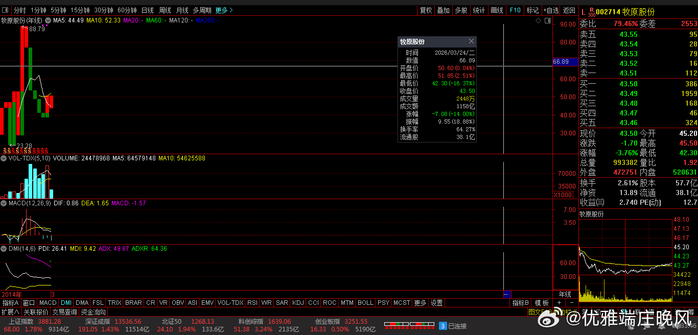 17、002714 牧原股份 43.50 -3.76% -3.34亿