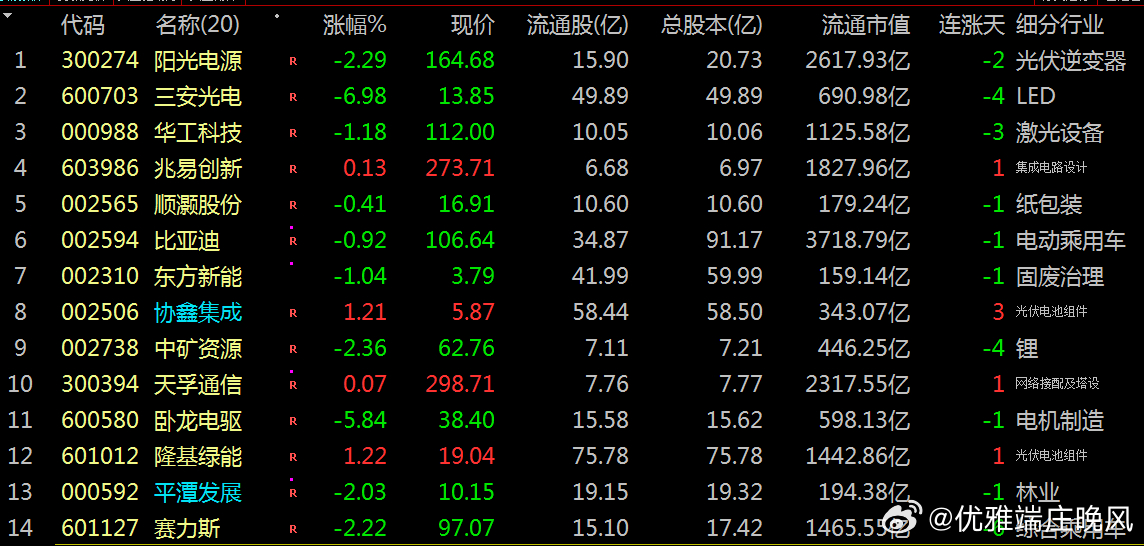 1、300274 阳光电源 164.68 -2.29% -13.72亿