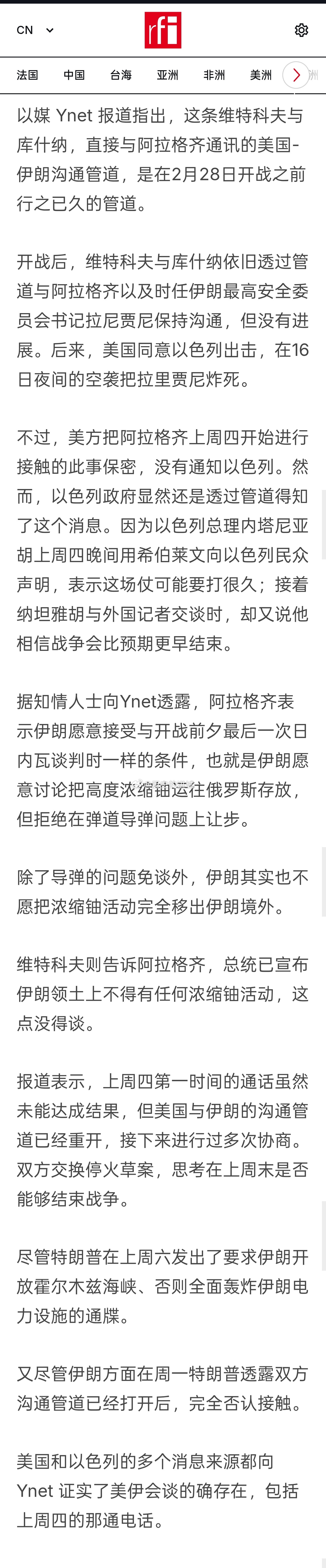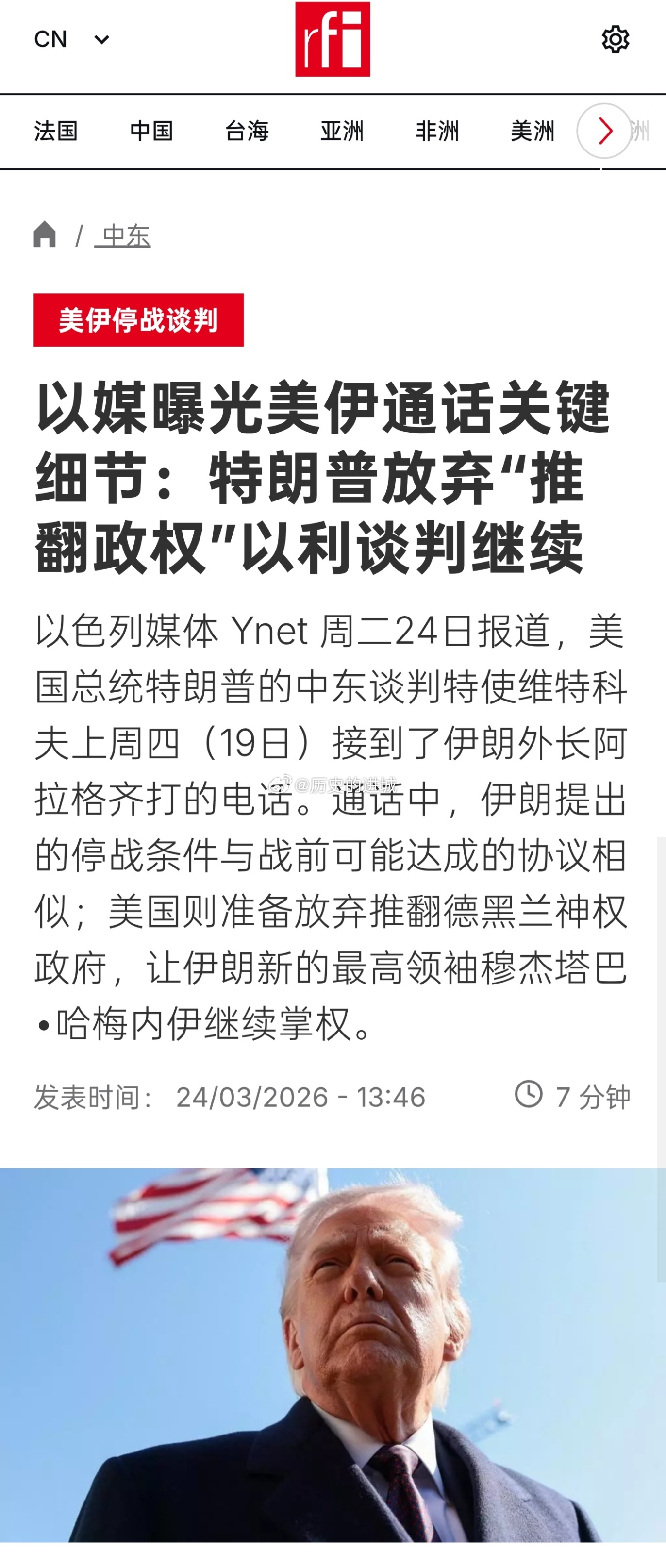 以色列被打穿了以色列媒体 Ynet 周二24日报道,美国总统特朗普的中东谈判特使维特科夫上周四(19日)接到了伊朗外长阿拉格齐打的电话。通话中,伊朗提出的停战条件与战前可能达成的协议相似;美国则准备放弃推翻德黑兰神权政府,让伊朗新的最高领袖穆杰塔巴•哈梅内伊继续掌权。报道最后说,目前美国与伊朗仍在积极磋商接下来的谈判,甚至有可能是美国副总统万斯与阿拉格齐进行会面。海外新鲜事