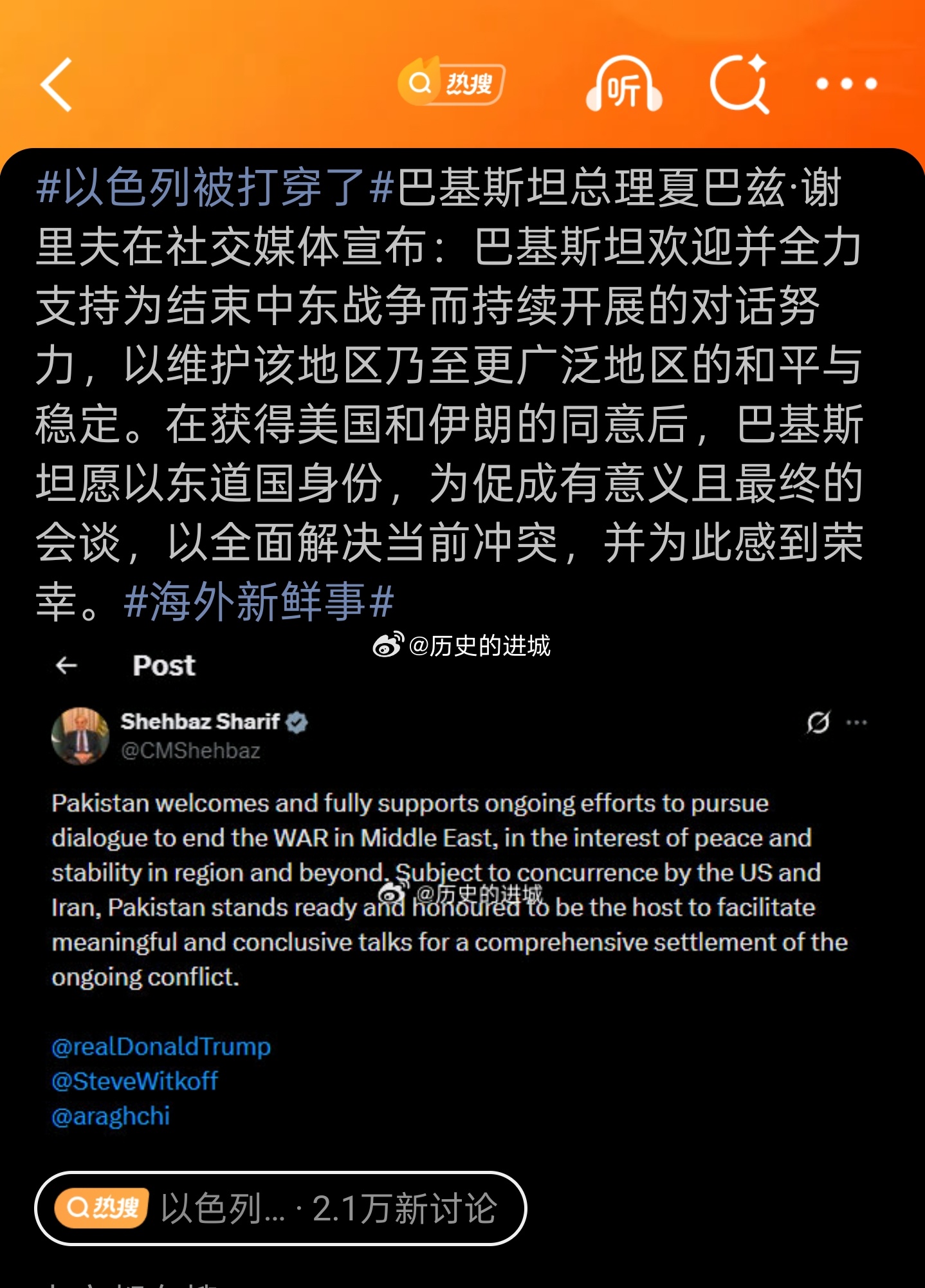 以色列被打穿了美国总统特朗普在社交媒体转发了巴基斯坦总理这条的帖子。