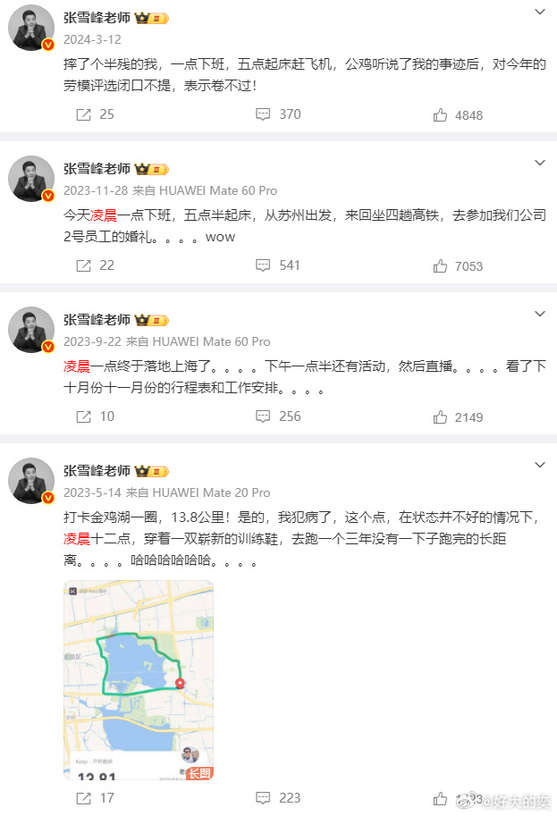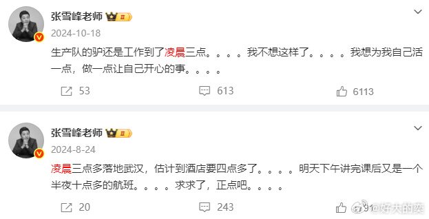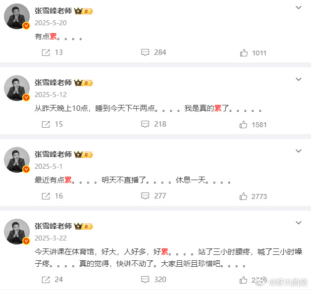 我发现在张雪峰微博里的高频词,一个是「凌晨」,一个是「累」。