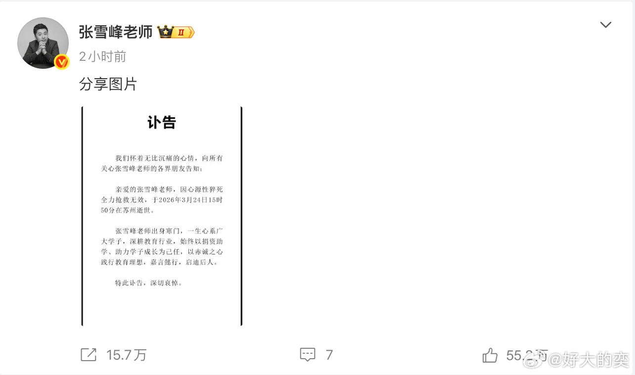 张雪峰走了,心源性猝死。