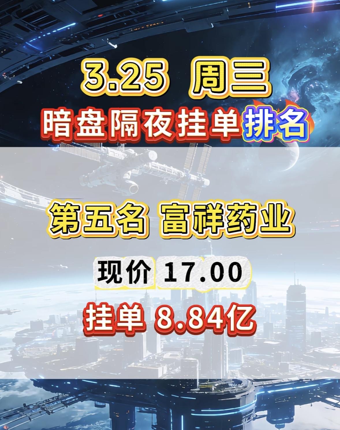 3月25日周三暗盘隔夜挂单排行榜出炉 富祥药业最近的表现有点猛啊!3月25日周三暗盘隔夜挂单排名第五,现价17.00,挂单就有8.84亿,这数据相当亮眼。 早在3月24日盘初,它就涨超17%,最高报17元。消息面上,公司预计一季度净利润5200 - 7500万元,同比增长2222.67% - 3250.01%,主要是VC、FEC量价齐升。另外,公司还有不少动作,比如为全资子公司提供担保、控股孙公司完成注册登记等。截止2026年2月27日,股权质押总比例9.39%。这富祥药业后续走势,值得好好关注。